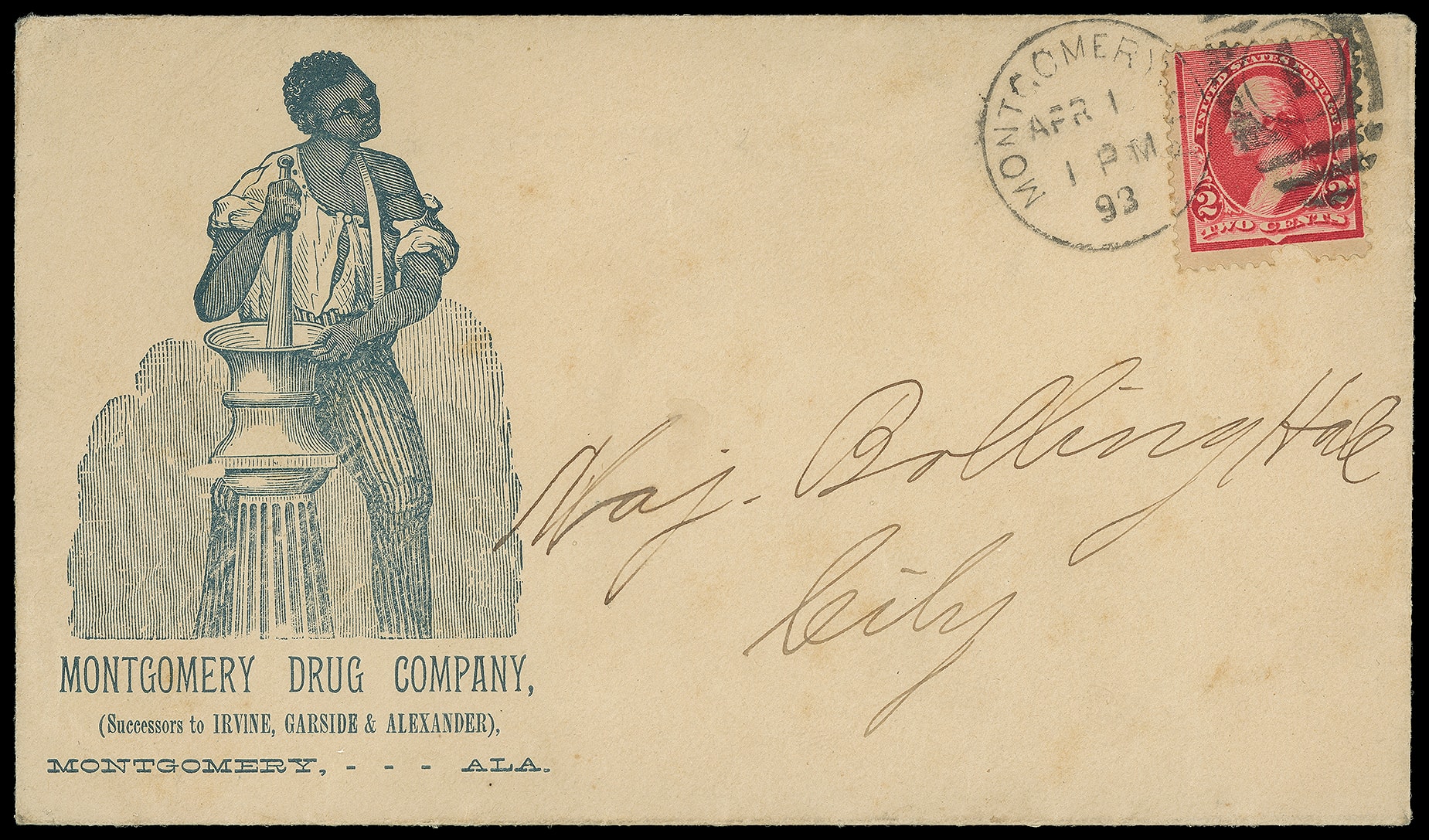 Montgomery Drug Company, Montgomery Ala. Blue black americana illustrated ad showing negro with large mortar and pestle on cover bearing 2¢ carmine (220) tied by "Montgomery Ala., Apr 1 '93" duplex to local address, original matching