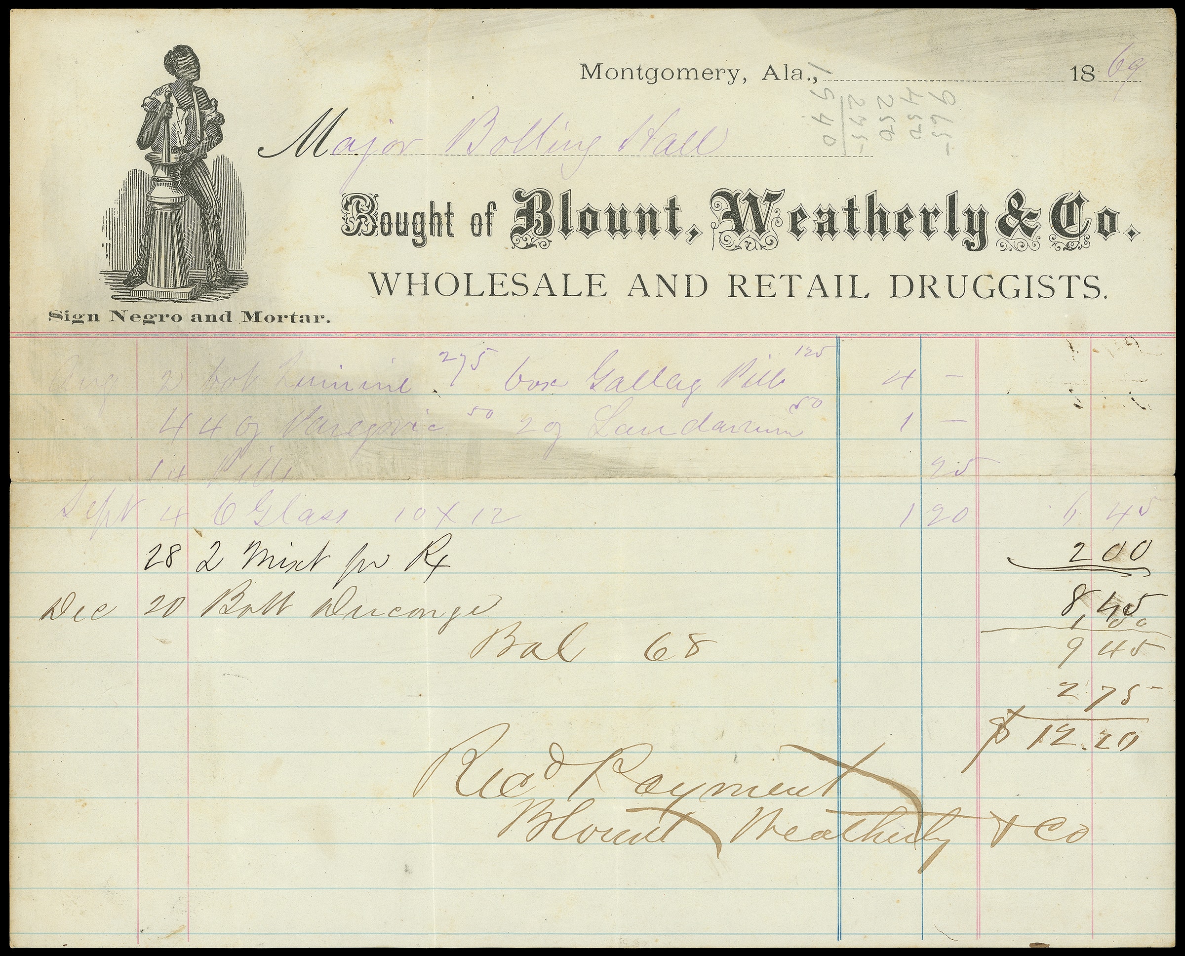 letterhead enclosure with "Sign Negro and Mortar" slogan for "Blount, Weatherly & Co. Wholesale and Retail Druggists" order; piece out at bottom, otherwise Very Fine and rare Black Americana medical ad. Estimate; $100 - 150. (Image1) (Image2)