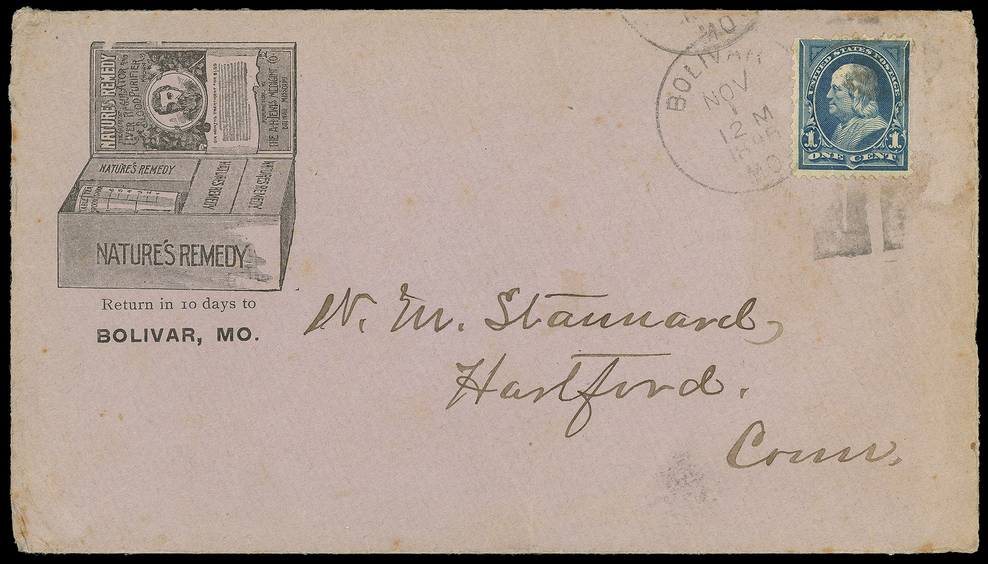 Remedy, The A.H. Lewis Medicine Co., Bolivar Mo. Illustrated corner card ad showing Nature's Remedy sales box on light purple cover bearing 1¢ blue (264), perf faults, tied by "Bolivar Mo., Nov 1, 1896" duplex to Hartford Conn.; some edge