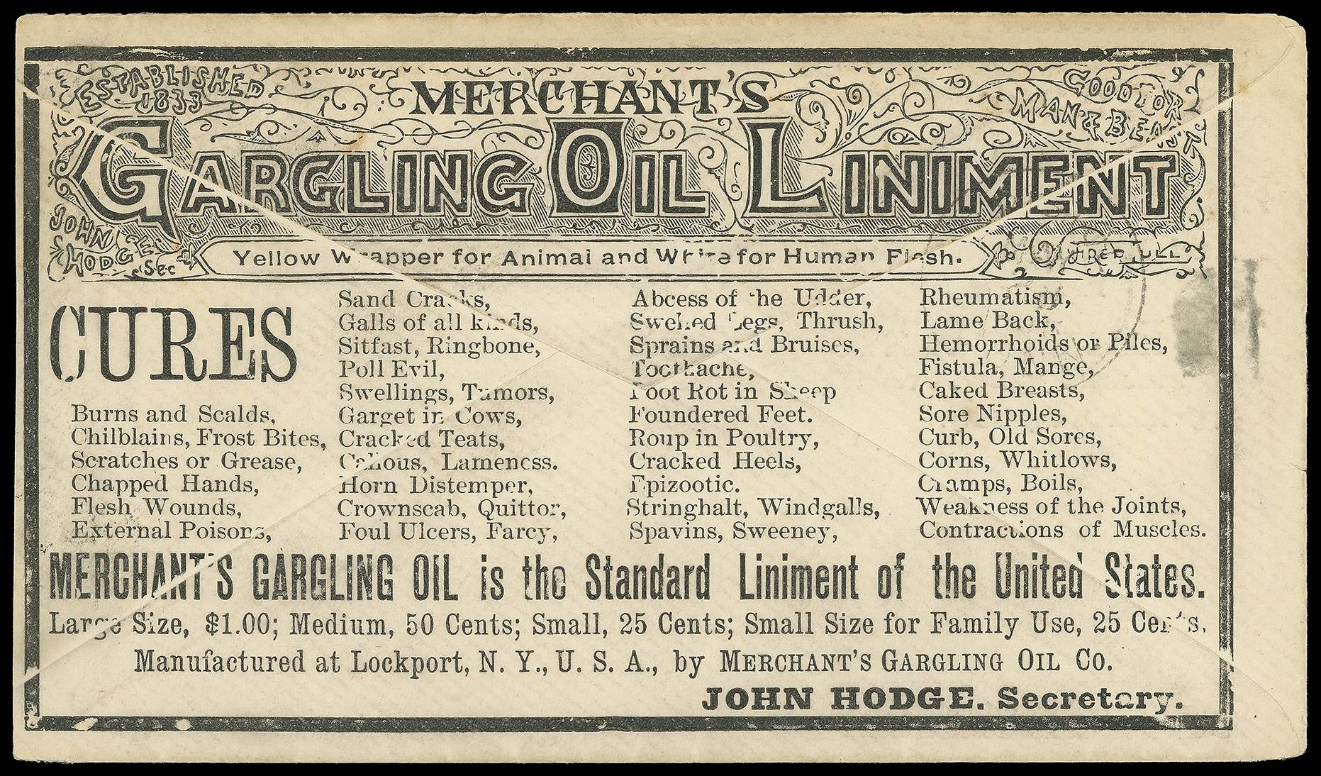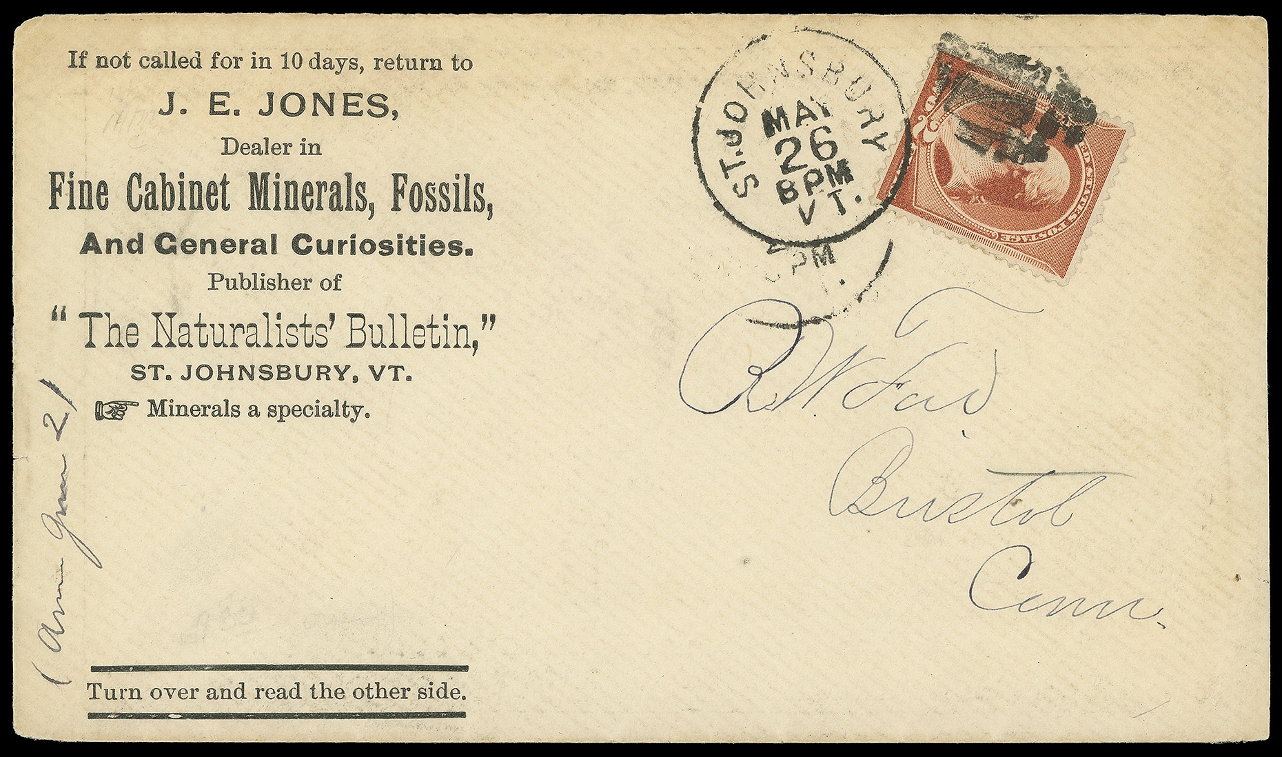 Merchant's Gargling Oil Liniment, Lockport N.Y. Overall ad on reverse of J.E. Jones dealer in Fine Cabinet Minerals, Fossils, and General Curiosities corner card cover bearing 2¢ red brown (210) tied by "St. Johnsbury Vt. May 26" duplex to