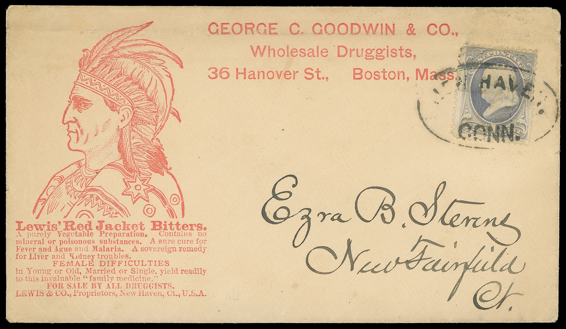 Red Jacket Bitters, George C. Goodwin & Co. Wholesale Druggists, Boston Mass. Red illustrated advertising design showing Indian on buff cover bearing 1¢ gray blue (206) tied by "New Haven, Conn." third-class oval to New Fairfield Ct.; light