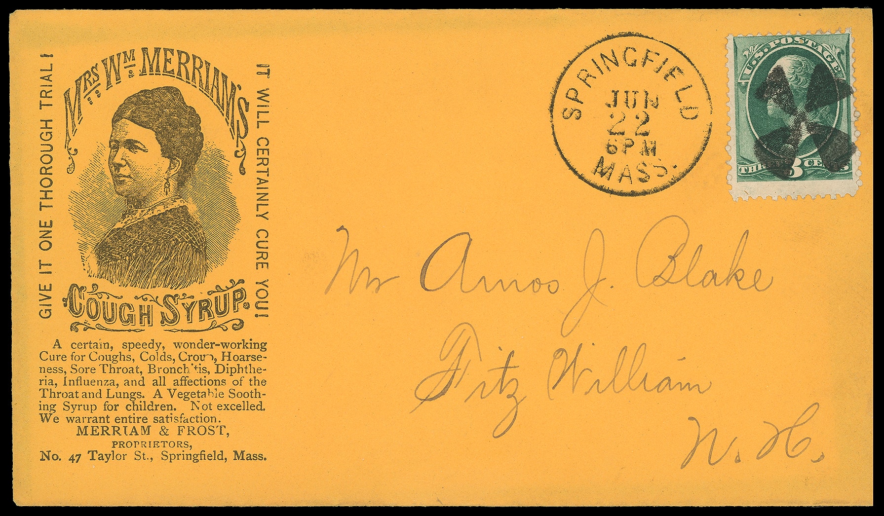 Merriam's Cough Syrup, Merriam & Frost, Springfield Mass. Illustrated advertising design showing Mrs. Merriam on bright orange cover bearing 3¢ green (158), rich color, canceled by bold cross duplexed with "Springfield Mass. Jun 22" cds to