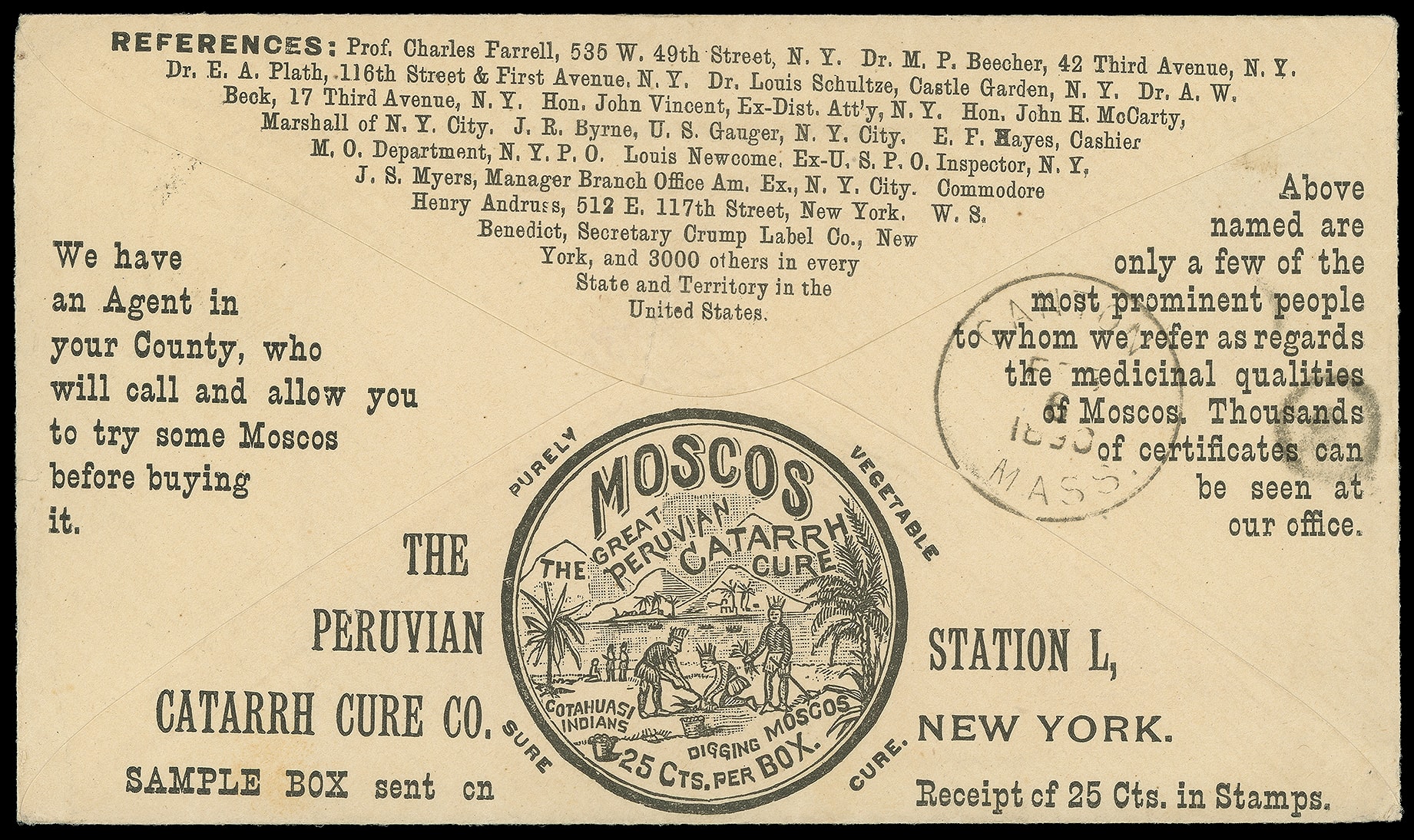 The Peruvian Catarrh Cure Co., New York N.Y. Overall illustrated ad showing Indians Digging trademark on unsealed cover bearing 1¢ ultramarine (212) tied by "New York, L" third-class oval on cover to East sharon Mass., "Sharon, Mass. Feb 5"