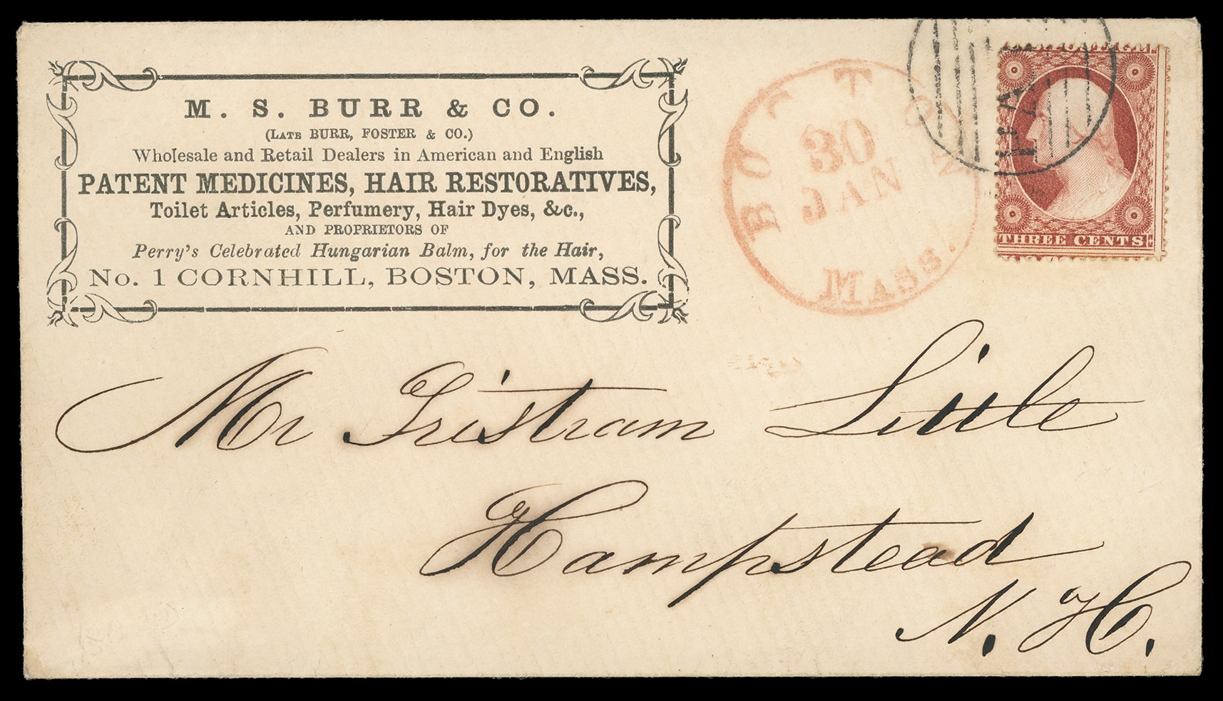 Medicines, Hair Restoratives, etc M.S. Burr & Co., Boston Mass. Fancy framed corner card on cover bearing 3¢ dull red (25) tied by large "Paid" grid, red "Boston, Mass. 30 Jan" cds on amber cover to Hampstead N.H., Very Fine and