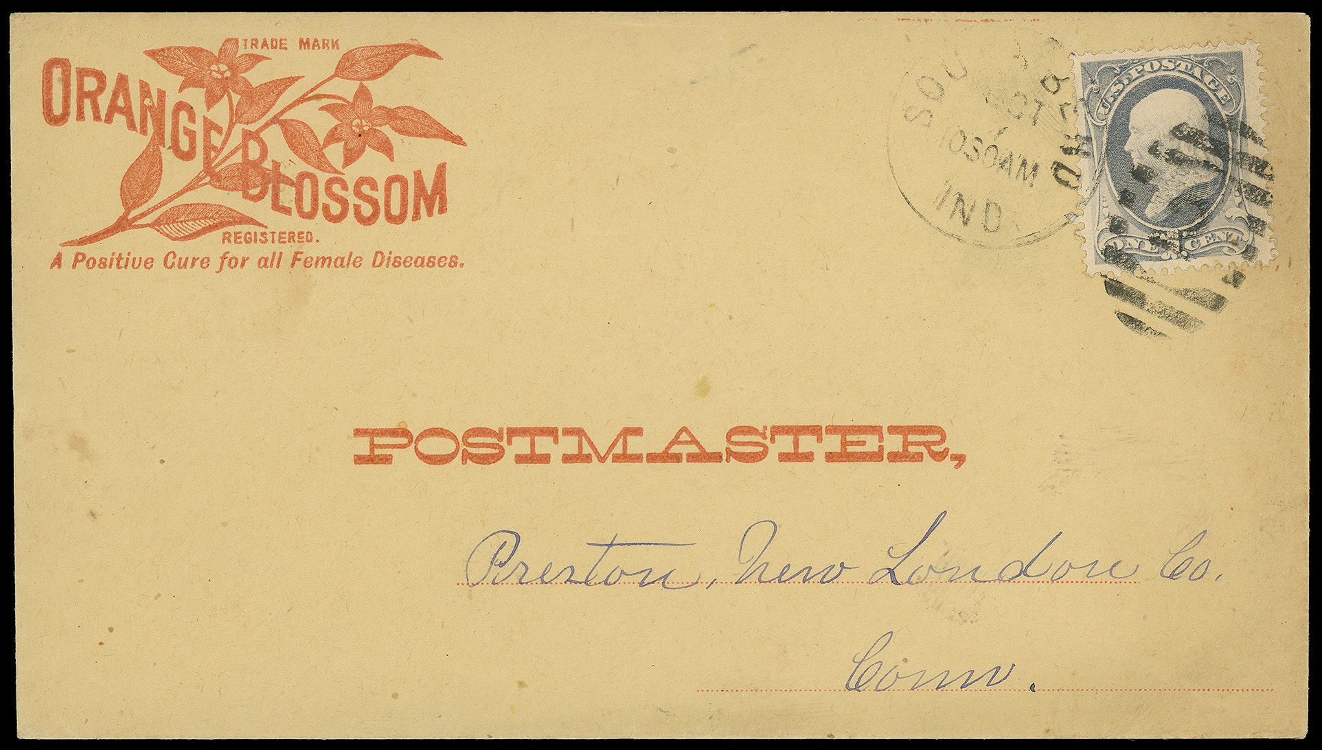 Blossom, A Positive Cure for all Female Diseases. Orange illustrated corner card showing orange blossom on unsealed buff cover bearing well centered 1¢ gray blue (206) tied "South Bend Ind. Oct 7" duplex to Preston Conn., Very