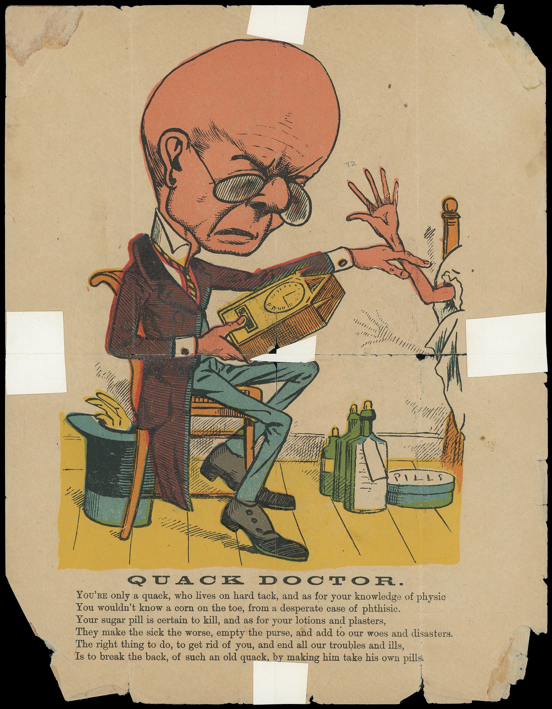 Doctor" Penny Dreadful Valentine. Multicolor comic with interesting verse "…You're only a quack who lives on hard tack, and as for your knowledge of physic, You wouldn't know a corn on the toe, from a desperate case. Your sugar pull is