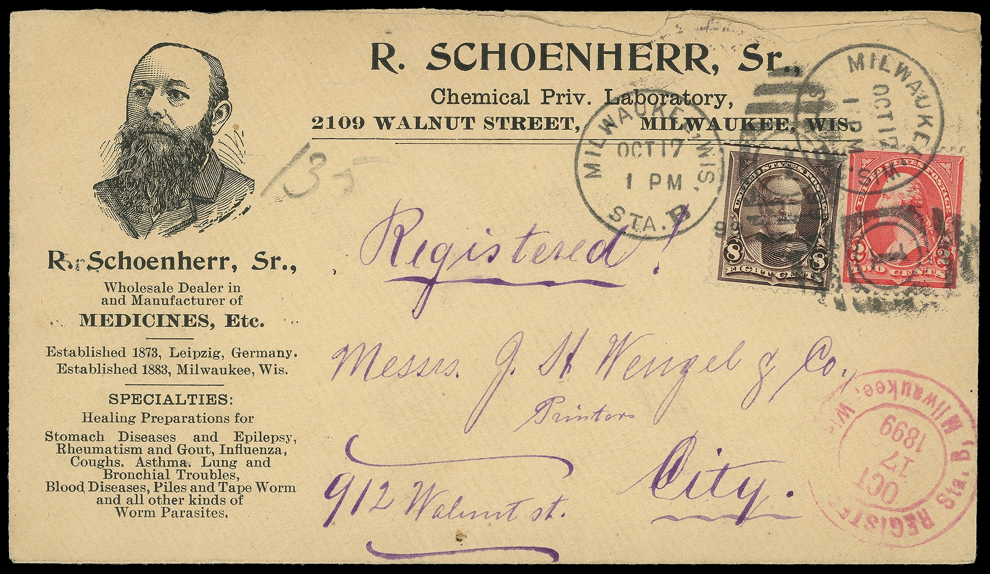 Schoenherr Sr., Chemical Priv. Laboratory, Milwaukee Wisc. Illustrated ad showing Schoenherr "Wholesale Dealer in and Manufacturer of Medicines, etc." on buff registered cover bearing 2¢ carmine (279B), 8¢ violet brown (272) tied by