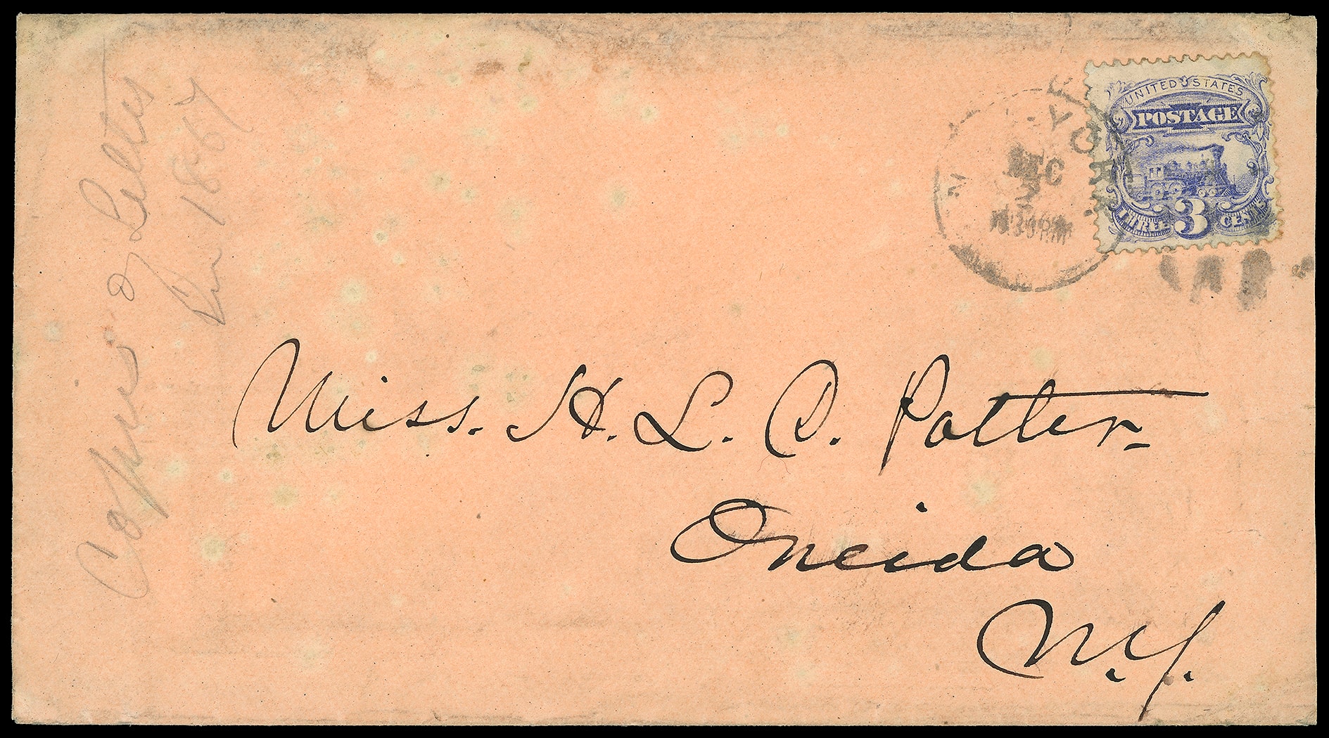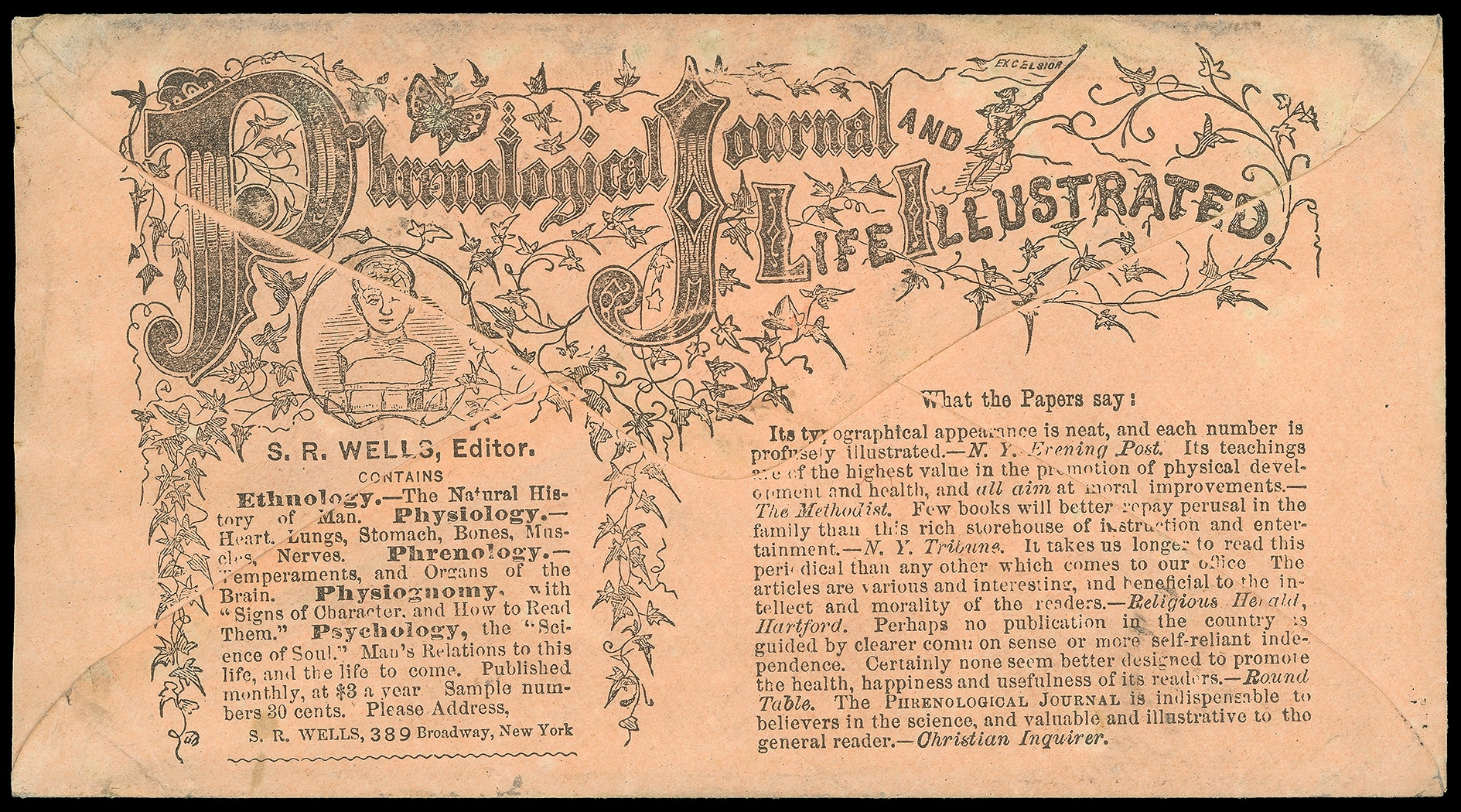 Phrenological Journal and Life Illustrated, S.R. Wells, Editor. Overall illustrated advertising on reverse of salmon envelope bearing 3¢ ultramarine (114) tied by "New York, Dec 7 duplex to Oneida N.Y.; some edge wear, aging and