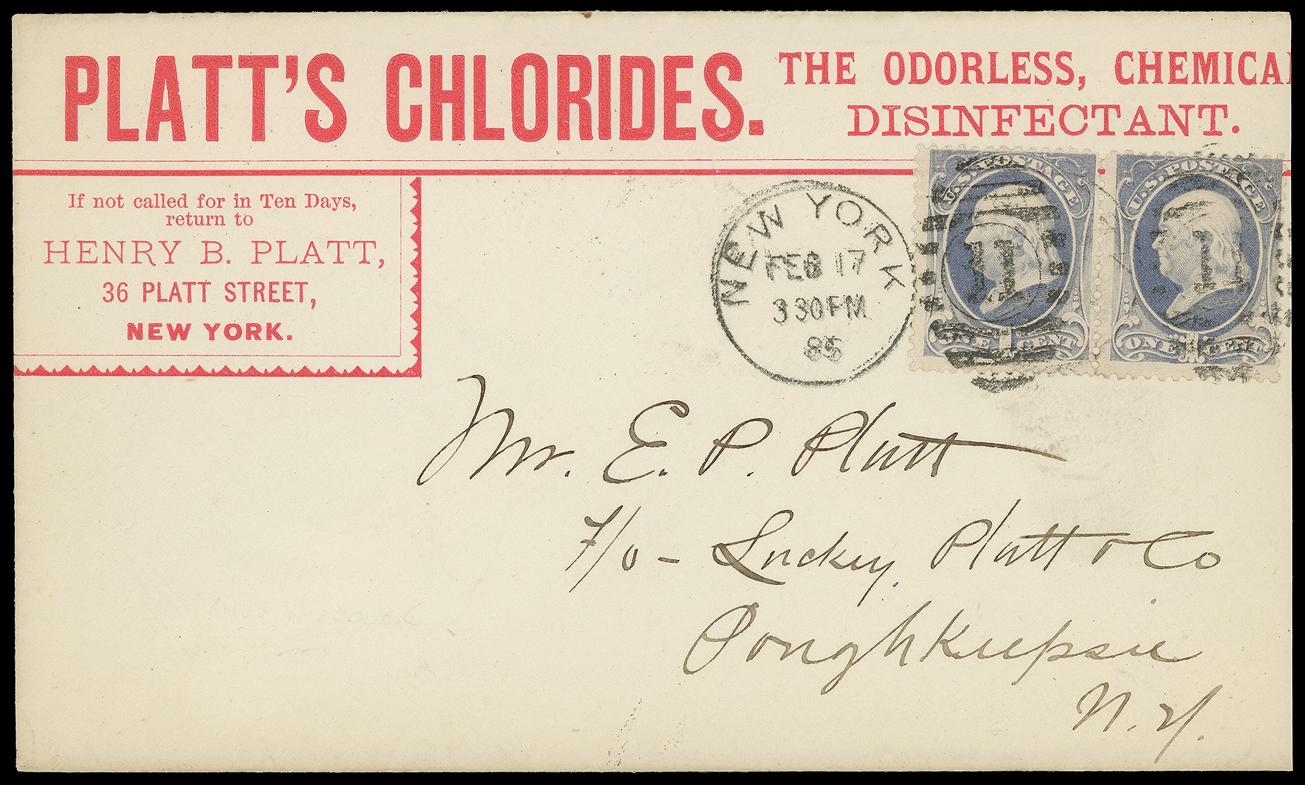 Chlorides, Henry B. Platt, New York N.Y. Red "The Odorless, Chemical, disinfectant" corner card on 1885 cover bearing 2¢ gray blue (206) pair tied by "New York, Feb 17 '85" duplex strikes to Poughkeepsie N.Y.; reduced slightly at right,