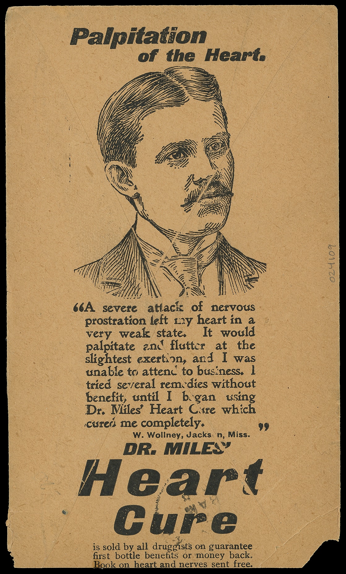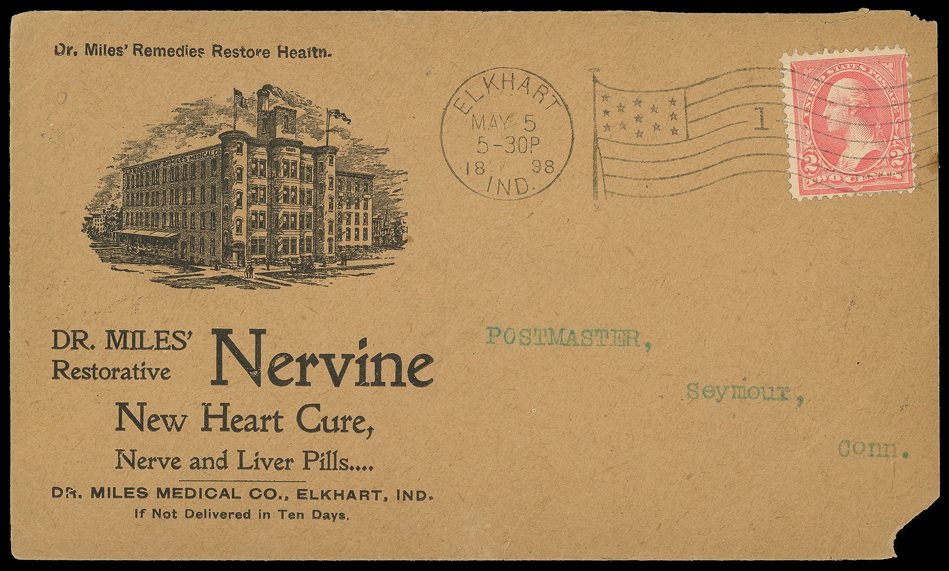 Restorative Nervine, Dr. Miles Medical Co., Elkhart Ind. Overall illustrated advertising showing illustration for "Nerve and Liver Pills" and on reverse Man with testimonial for Dr. Miles' "Heart Cure" on buff cover bearing 2¢ pink (279Bc)