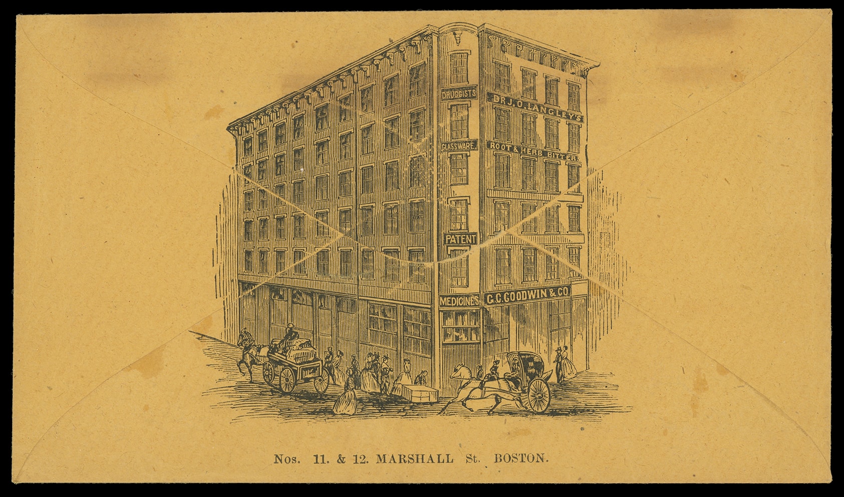 Medicines, 11 & 12 Marshall St, Boston Mass. Illustrated building advertising on reverse of orange cover bearing 3¢ rose (25) tied by large Boston "Paid" grid, adjacent red "Boston, Mass. 11 Jan" cds to Bangor Me., Very