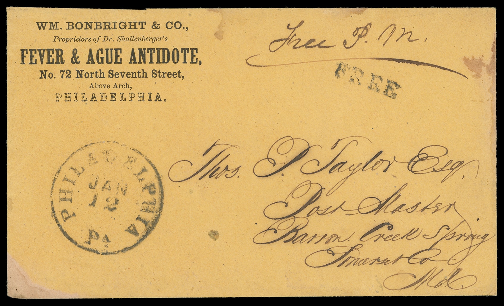 Shallenburger's Fever & Ague Antidote, Bonbright & Co., Phila. Pa. Printed cornercard on orange cover with postmaster free frank "Free P.M.", "Philadelphia Pa. Jan 12" cds and "Free" rating handstamp to Barren Creek Md.; light edge stains,