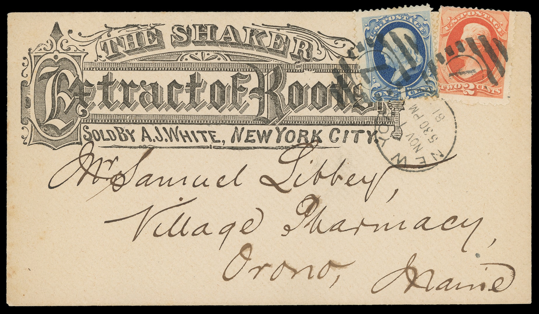 Shaker Extract of Roots, A.J. White, New York N.Y. Ornate corner card advertising on cover bearing 1¢ blue (182) and 2¢ vermilion (183), vibrant colors, both tied by "New York, Nov 1 '81" duplex to Village Pharmacy, Orono
