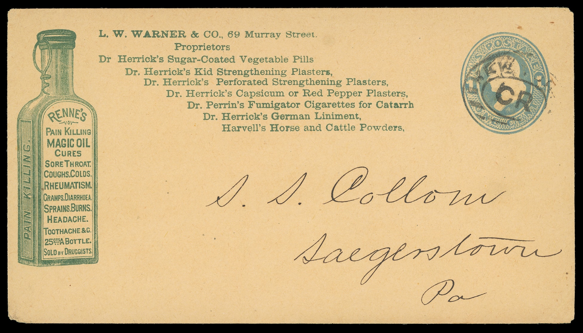 Paining Killing Magic Oil, L.W. Warner & Co. Attractive green illustrated advertising on 1¢ blue (U115) cream entire canceled by "New York, CR" double-oval to Saegertown Pa., Very Fine and choice, ex- C.L. Wunsch