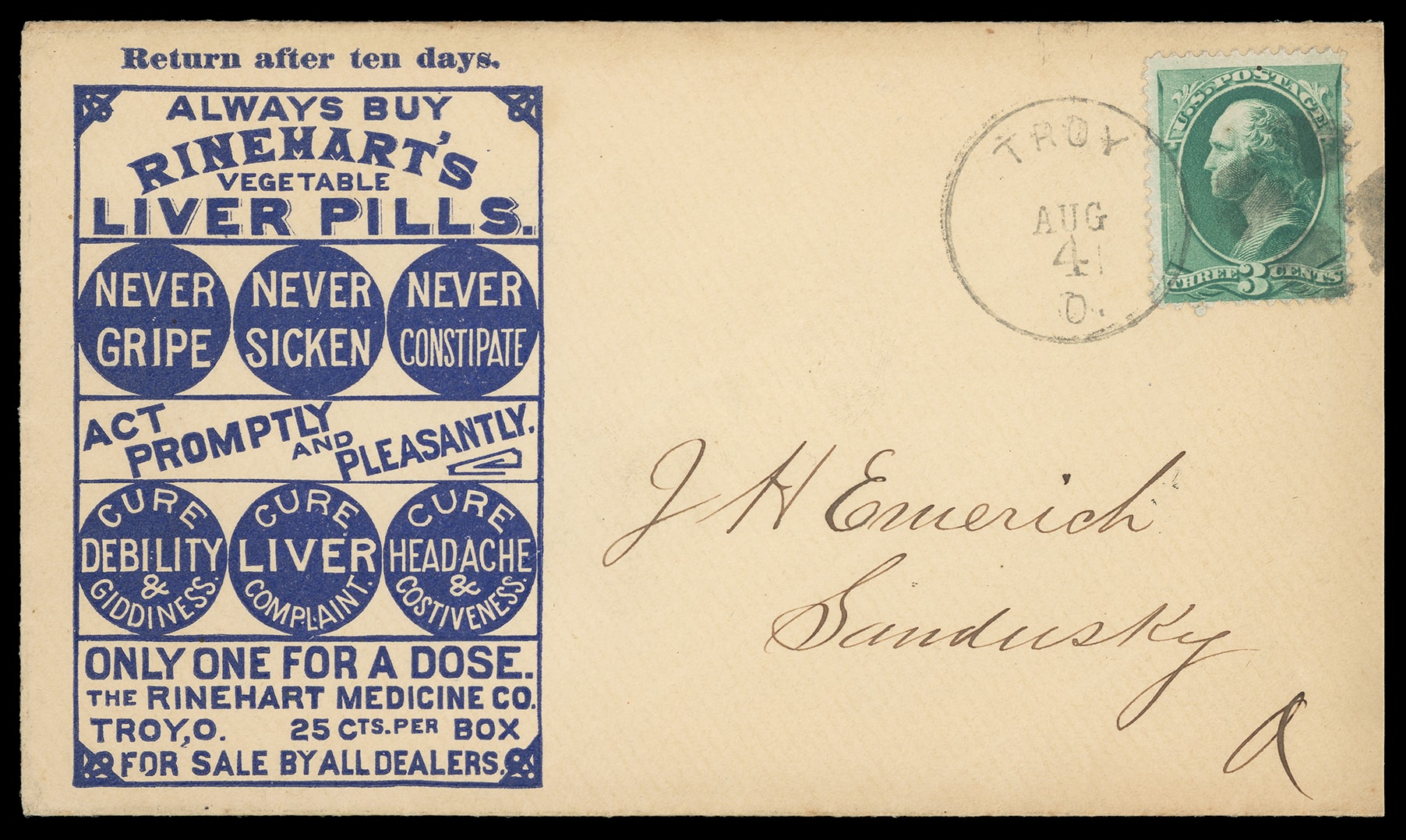 Rinehart's Vegetable Liver Pills, Rinehart's Medicine Co., Troy O. Blue illustrated advertising showing pills on amber cover bearing 3¢ green (184) tied by "Troy O. Aug 4" duplex to Sandusky, Ohio; light edge toning (trivial), Very Fine