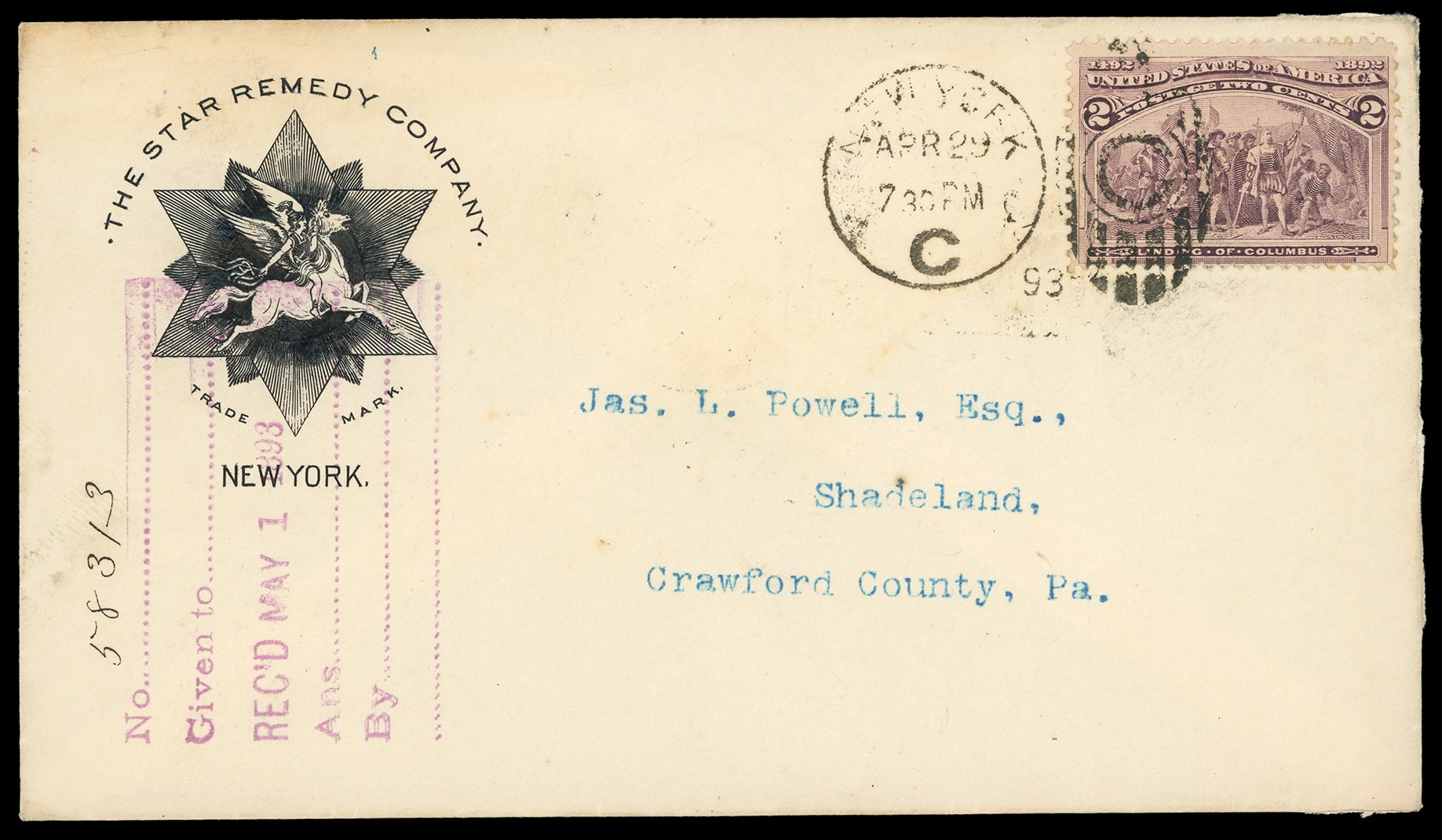 Remedy Co, New York. Illustrated design on amber cover bearing 2¢ Columbian (231) tied by "New York, C, Apr 29 '93" duplex to Shadeland Pa., 1893 arrival backstamp, purple May 1, 1893 company receiving handstamp, Very