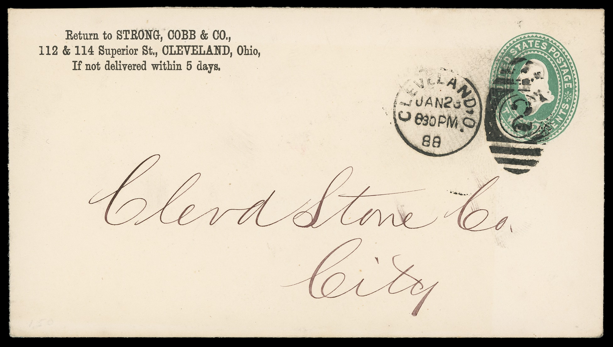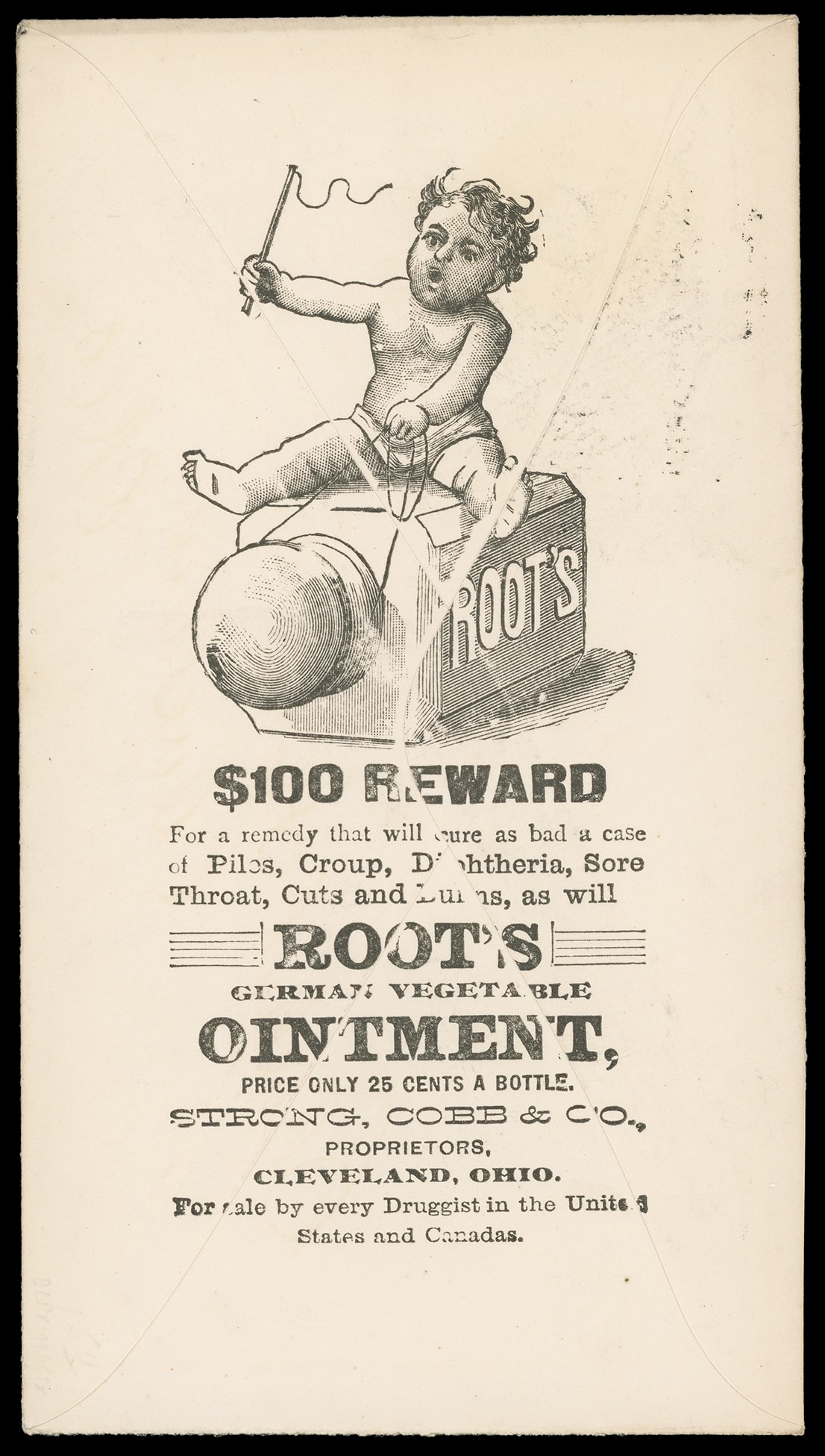 Vegetable Ointment, Strong Cobb & Co., Cleveland Ohio. Overall illustrated advertising showing baby on medicine bottle on reverse of 2¢ green entire canceled by "Cleveland, O. Jan 23 '88" duplex to local address, Extremely