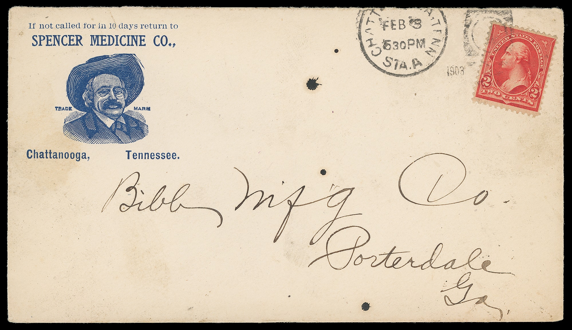 Medicine Co., Chattanooga, Tenn. Blue illustrated corner card showing man with hat on cover bearing 2¢ red (279B) tied by "Chattanooga, Tenn. Sta A, Feb 3, 1903" duplex to Porterdale Ga.; few stain spots, F.-V.F. Estimate; $50 -