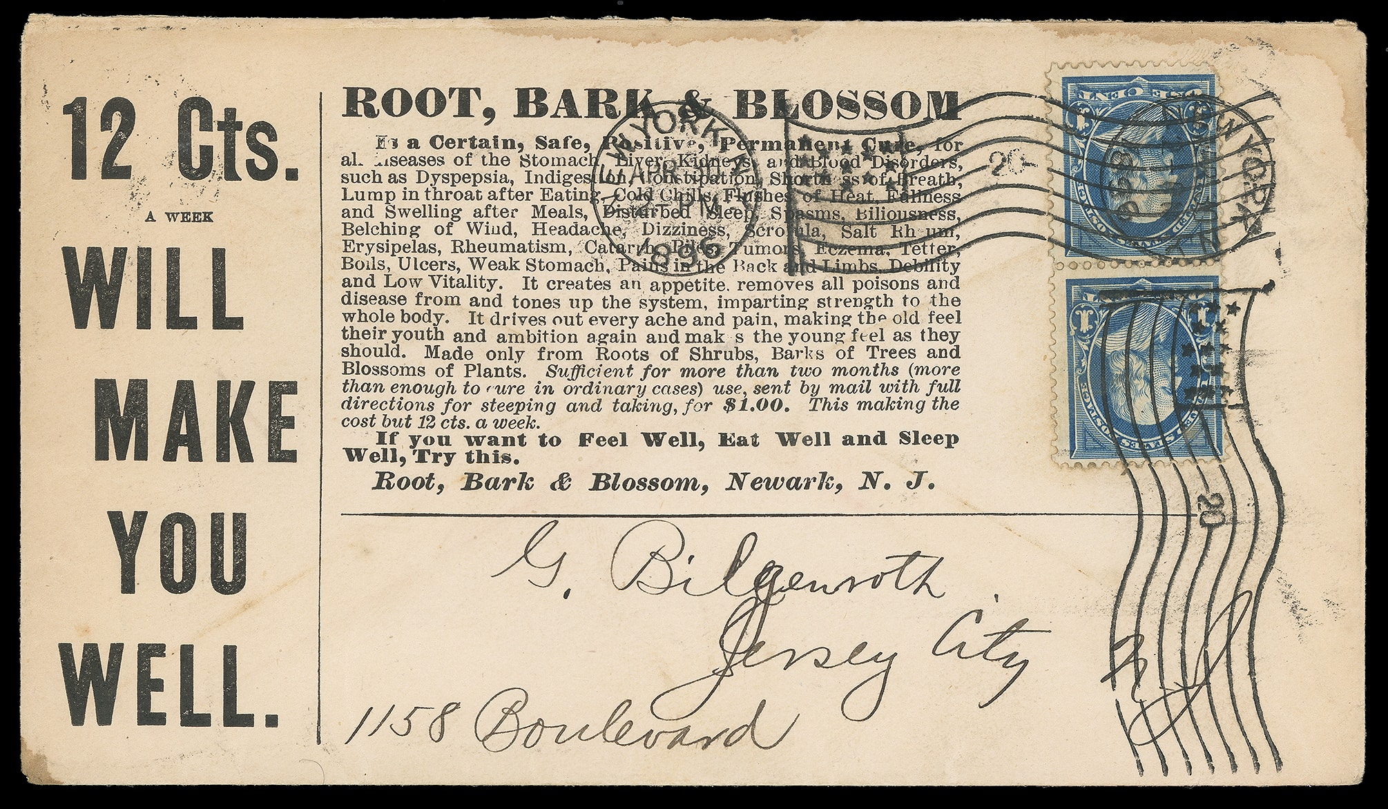 Bark & Blossom, Newark N.J. Near overall advertising with "12¢ A Week Will Make You Well" slogan on unsealed cover bearing two 1¢ blue (264) singles tied by multiple "New York, N.Y., Apr 10, 1896" flag machine cancels to Jersey city