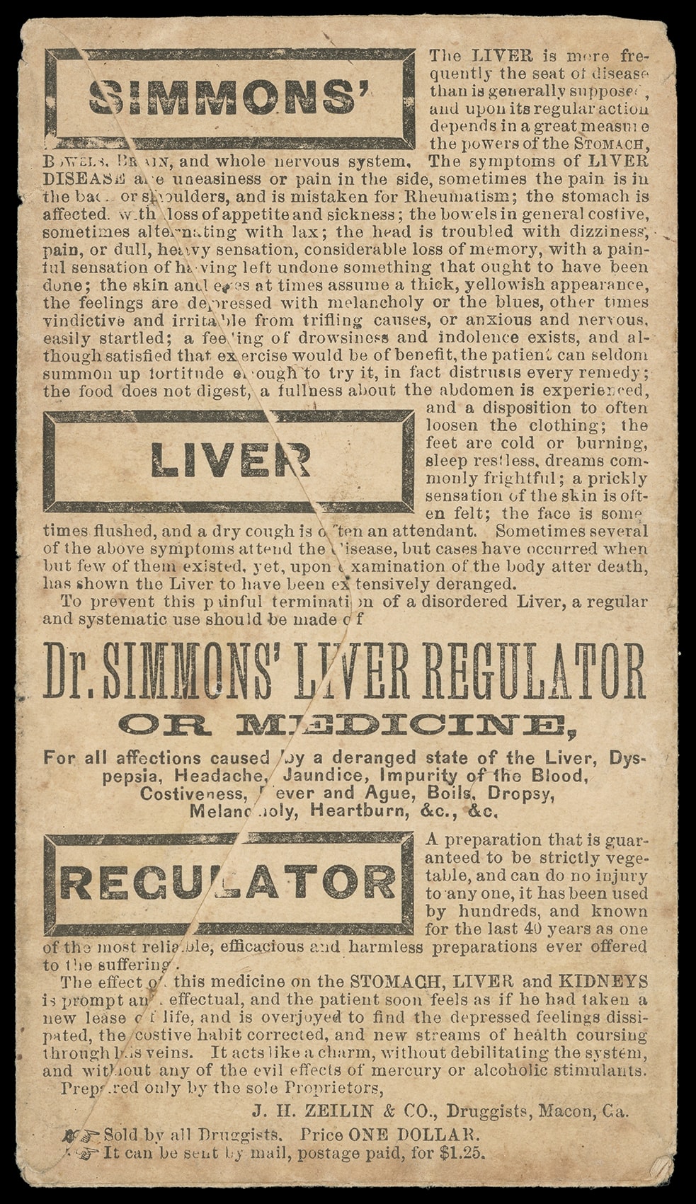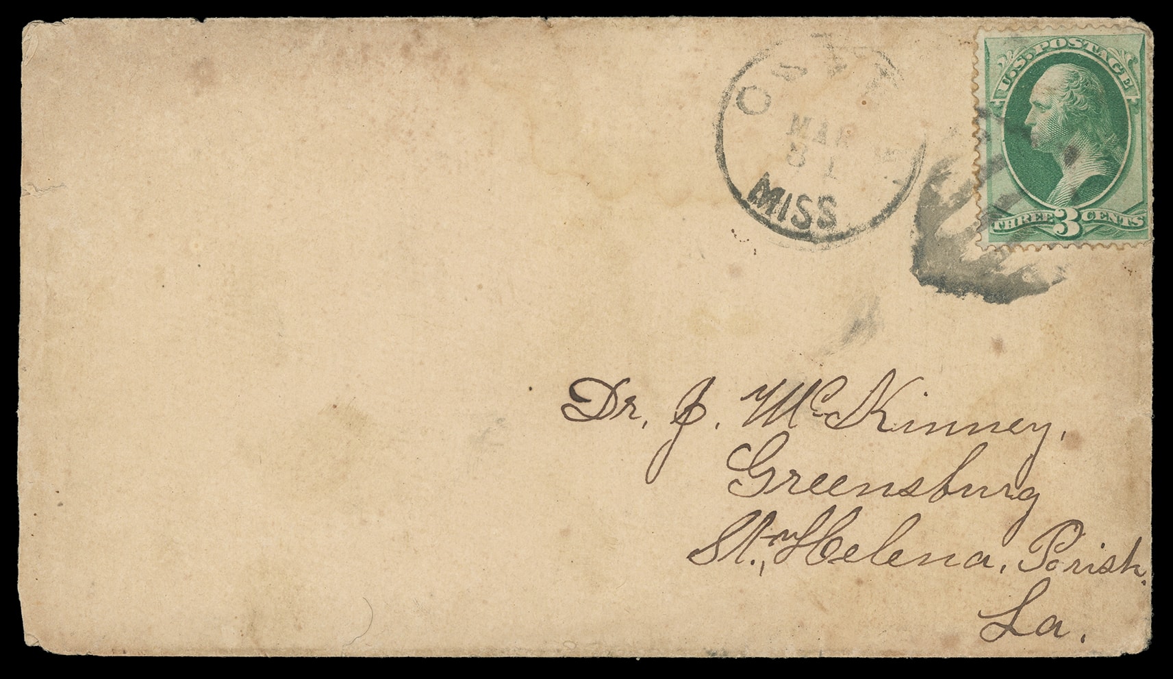 Liver Regulator, J.H. Zeilin Co, Druggists, Macon Ga. Overall advertising on reverse of cover bearing 3¢ green (147) tied by partial shield fancy cancel duplexed with "Owasco, Miss. Mar 31" cds to Greensburg, La.; wear and soiling,