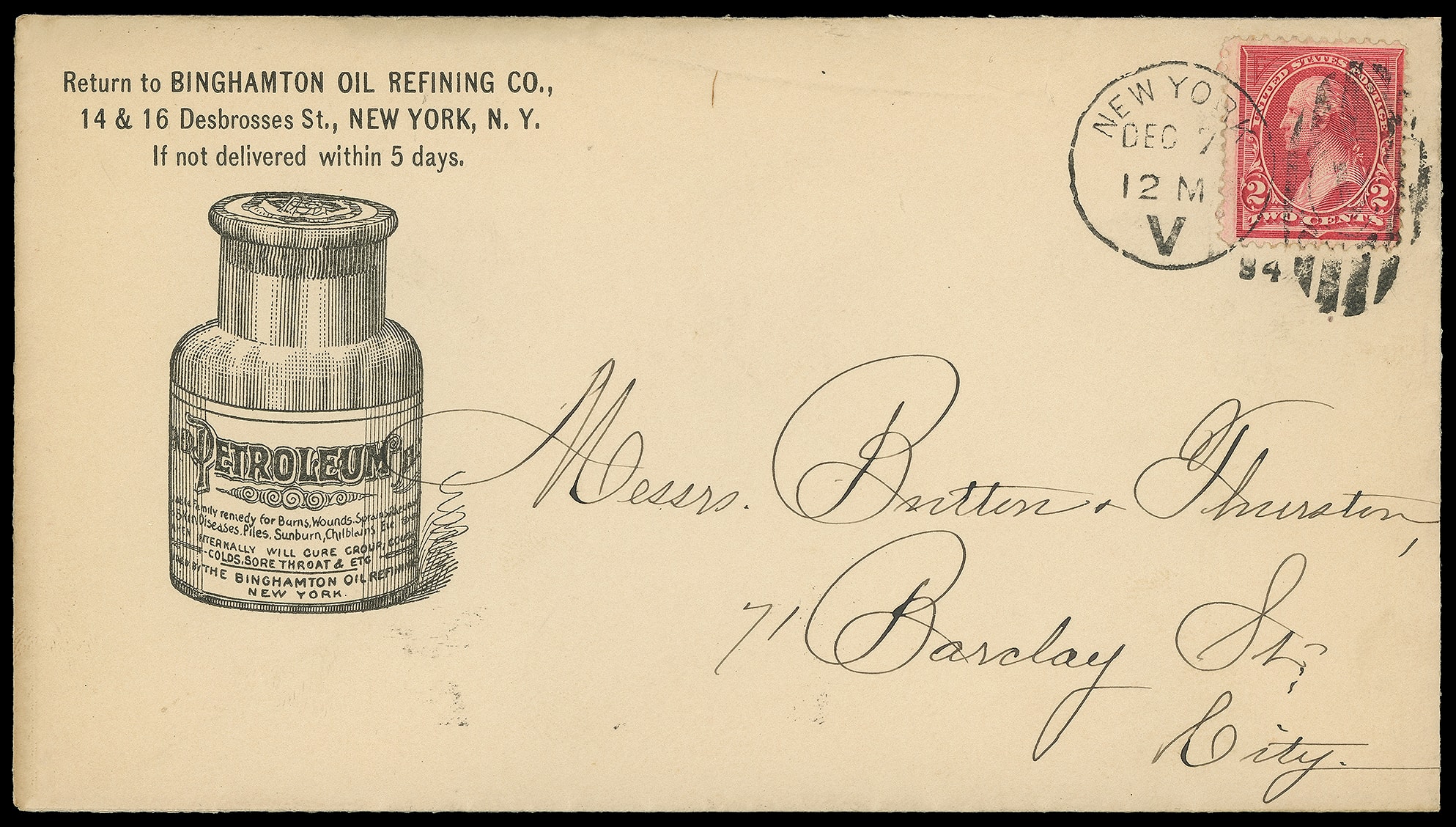 Jelly, Binghampton Oil Refining Co., New York N.Y. Illustrated ad design showing medical bottle on 1894 cover bearing 2¢ carmine lake (249) tied by "New York 'V' Dec 7 '94" duplex to local street address, Dec. 7th machine receiving cds,
