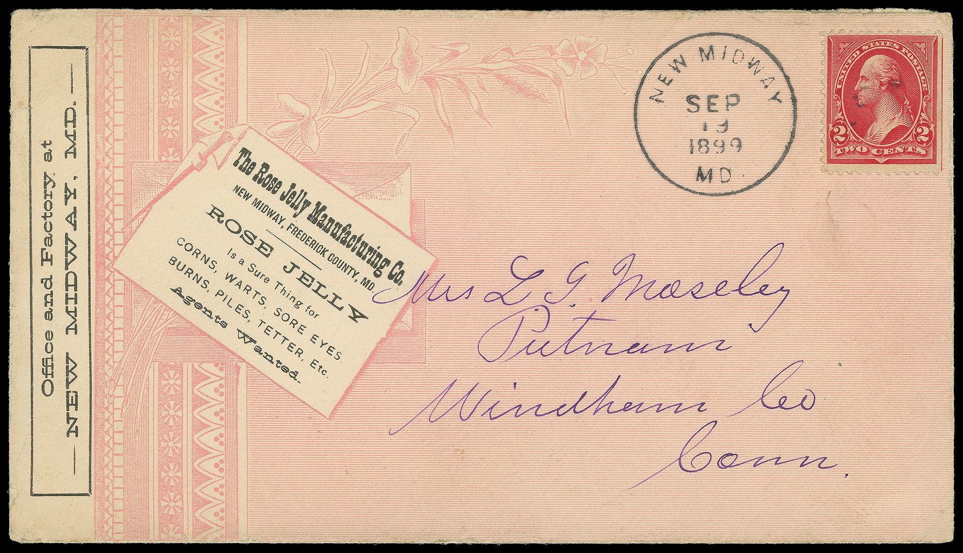 Jelly Manufacturing Co., New Midway Md. Pink overall illustrated shaded ad design on cover bearing 2¢ red (279B) guideline s.e., light cancel duplexed with neat "New Midway Md. Sep 19, 1899" cds to Putnam Conn., Sep. 20th arrival backstamp,