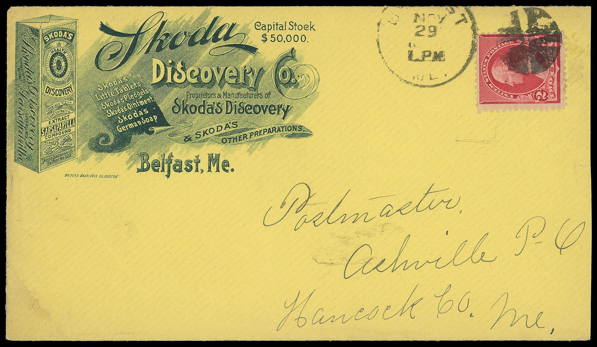 Discovery with Sarsaparilla Compound, Skoda Discovery Co., Belfast Me. Blue illustrated ad showing medicine box on yellow cover bearing 2¢ lake (219D) tied by quartered cork duplexed with partial "Belfast Me. Nov 29" cds to Ashville Me.;