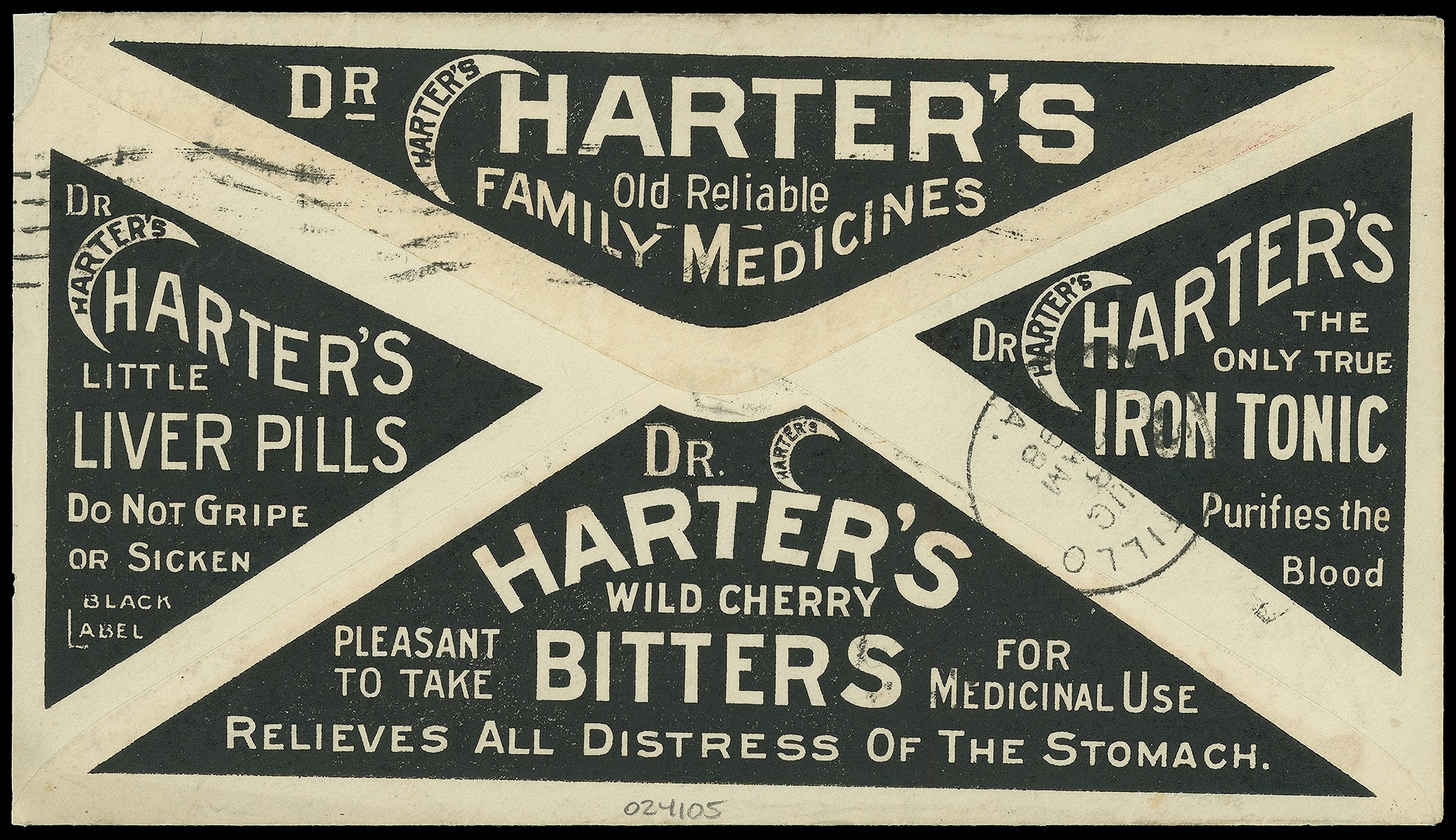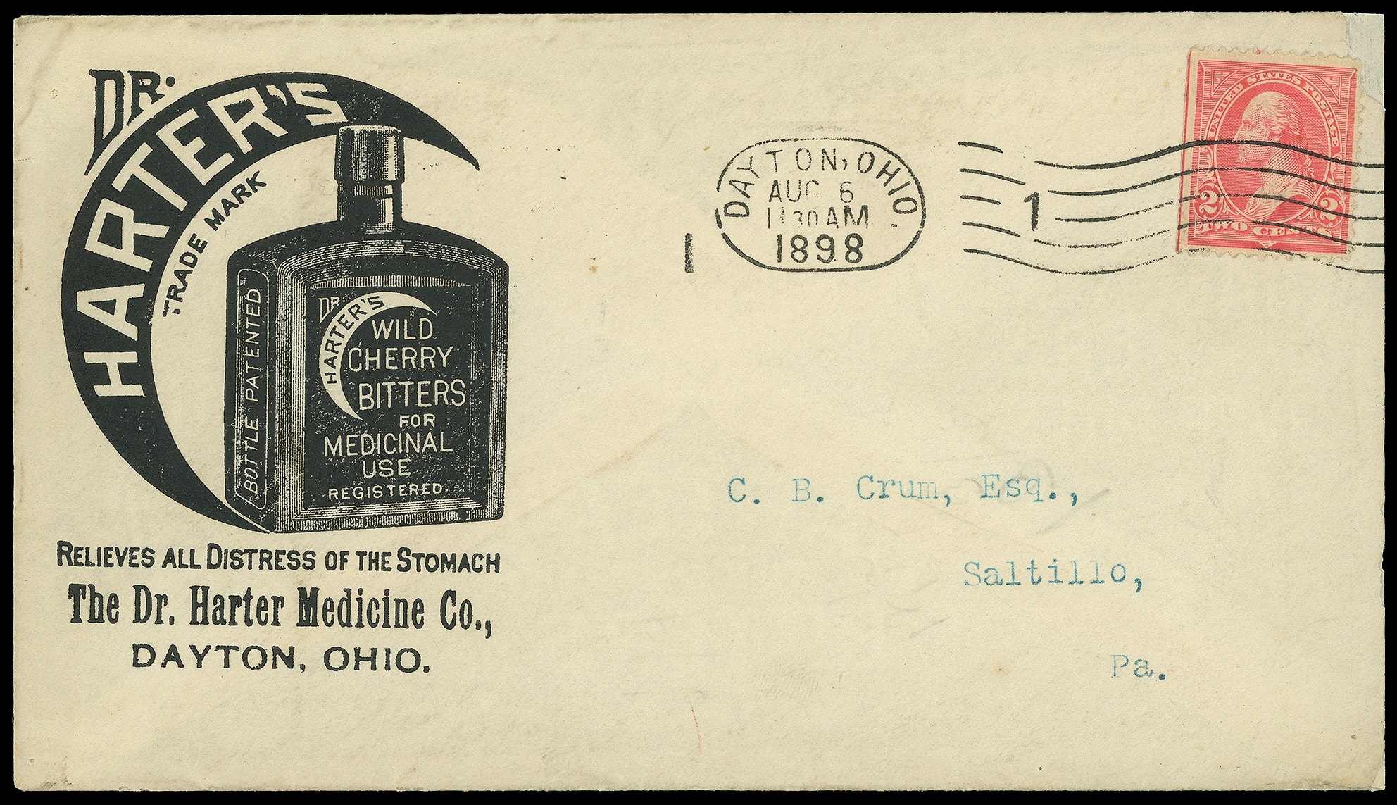Cherry Bitters, Dr. Harter Medicine Co., St Louis Mo. Illustrated advertising on both sides of cover bearing 2¢ rose carmine (279Bc) tied by "Dayton, Ohio, aug 6, 1898" machine cancel to Saltillo Pa.; reduced slightly right with minor top