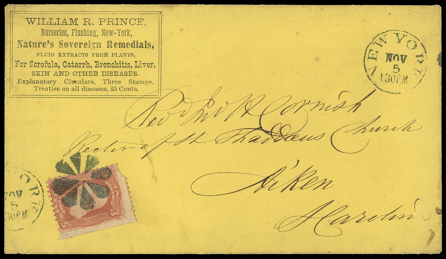 R. Prince, Nature's Sovereign Remedials, Flushing N.Y. Rectangular framed corner card on yellow cover bearing 3¢ red, grilled (94) s.e., corner flaw, tied by fancy circle of wedges cancel duplexed with "New York, Nov 5" cds to Aiken S.C.,