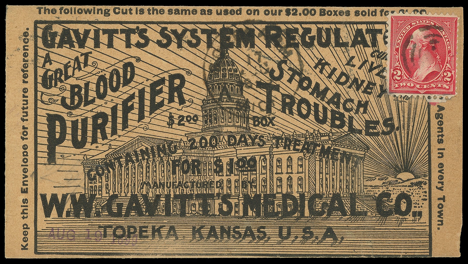 Gavitt's Medical Co., Topeka Kans. Overall illustrated ad design for "A Great Blood Purifier" on manila return envelope bearing 2¢ Bureau canceled by segmented target, matching "Mich. 17 Aug 1897" cds to Topeka Kansas, reverse with Topeka