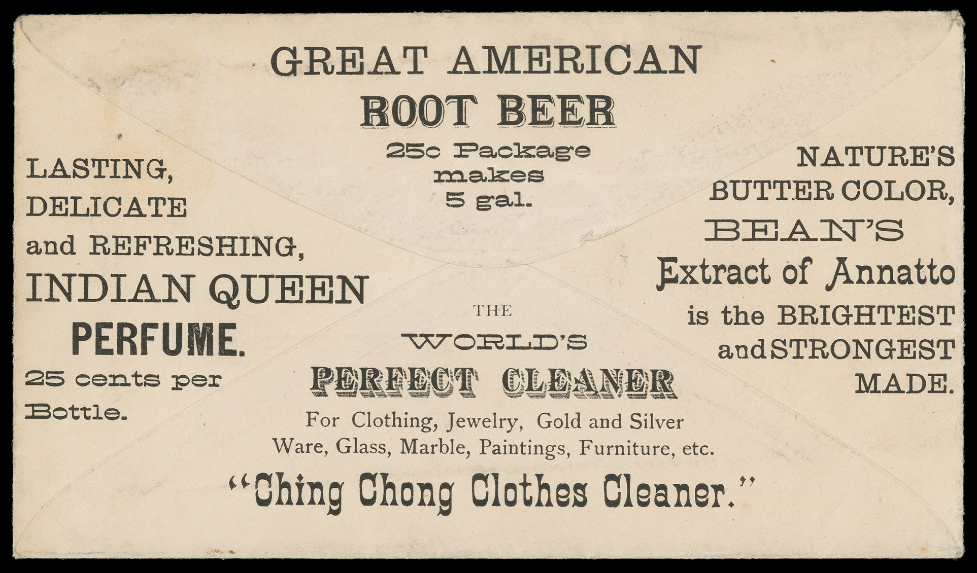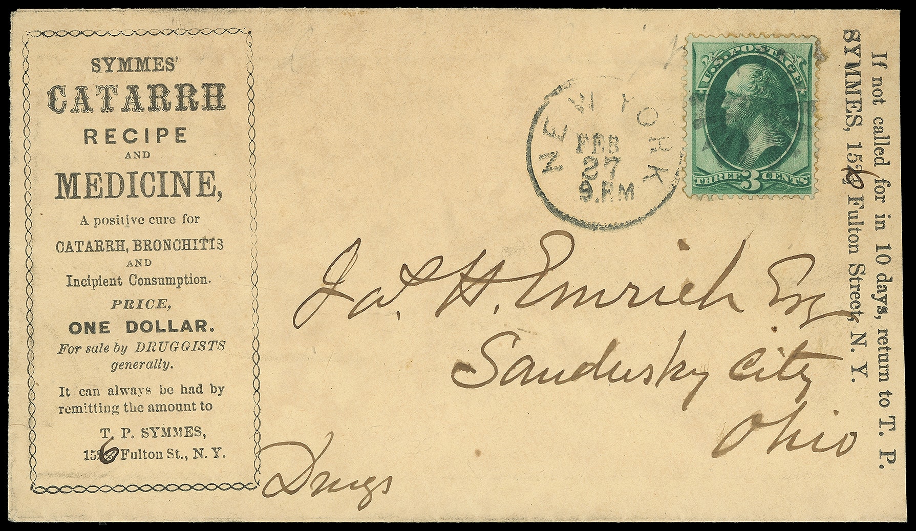 Catarrh Recipe and Medicine, T.P. Symmes, New York N.Y. Fancy boxed advertising on amber cover bearing 3¢ green (147) canceled by circle of wedges duplexed with "New York Feb 27" cds to Sandusky City, Ohio; reduced slightly at right,