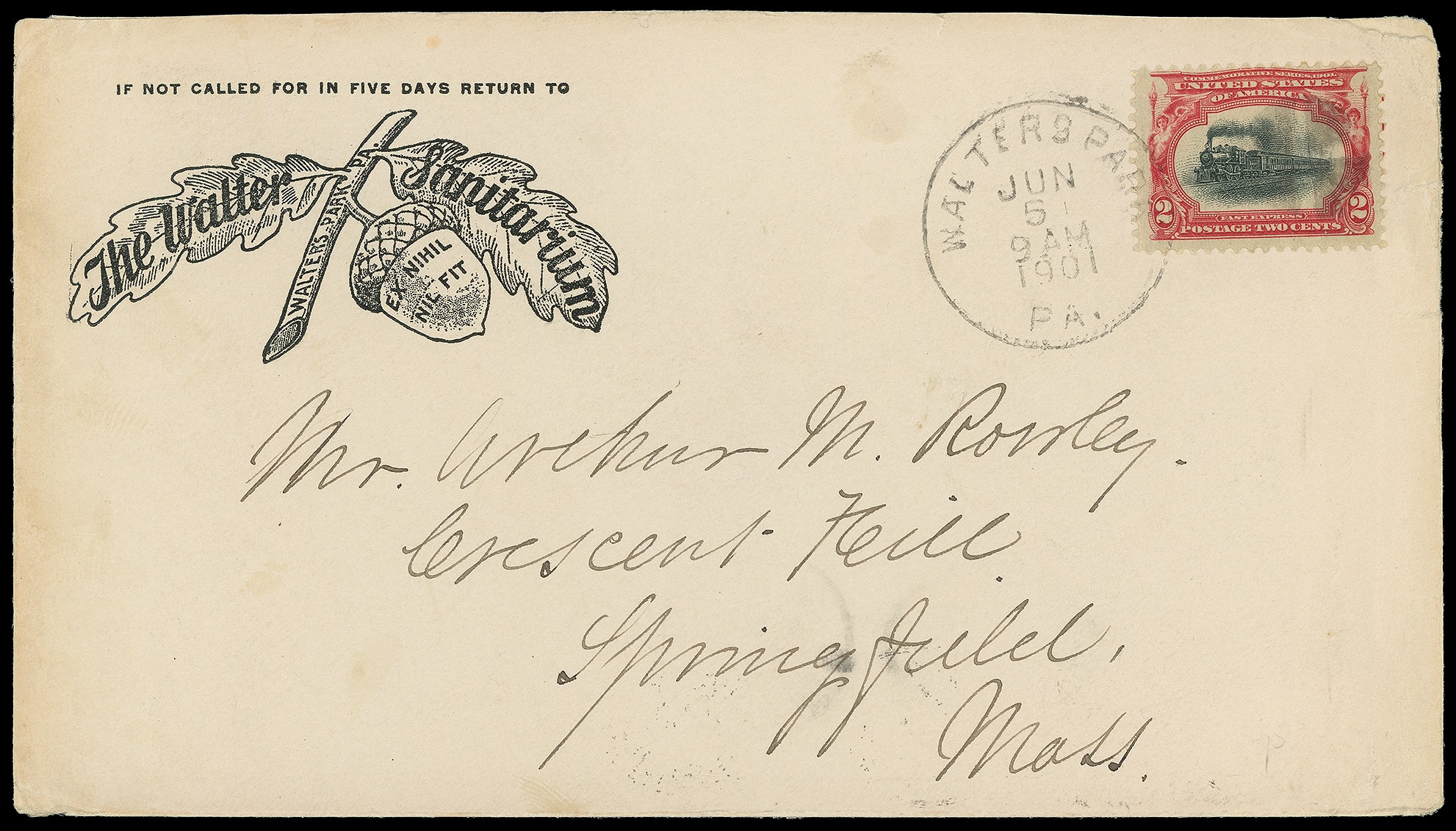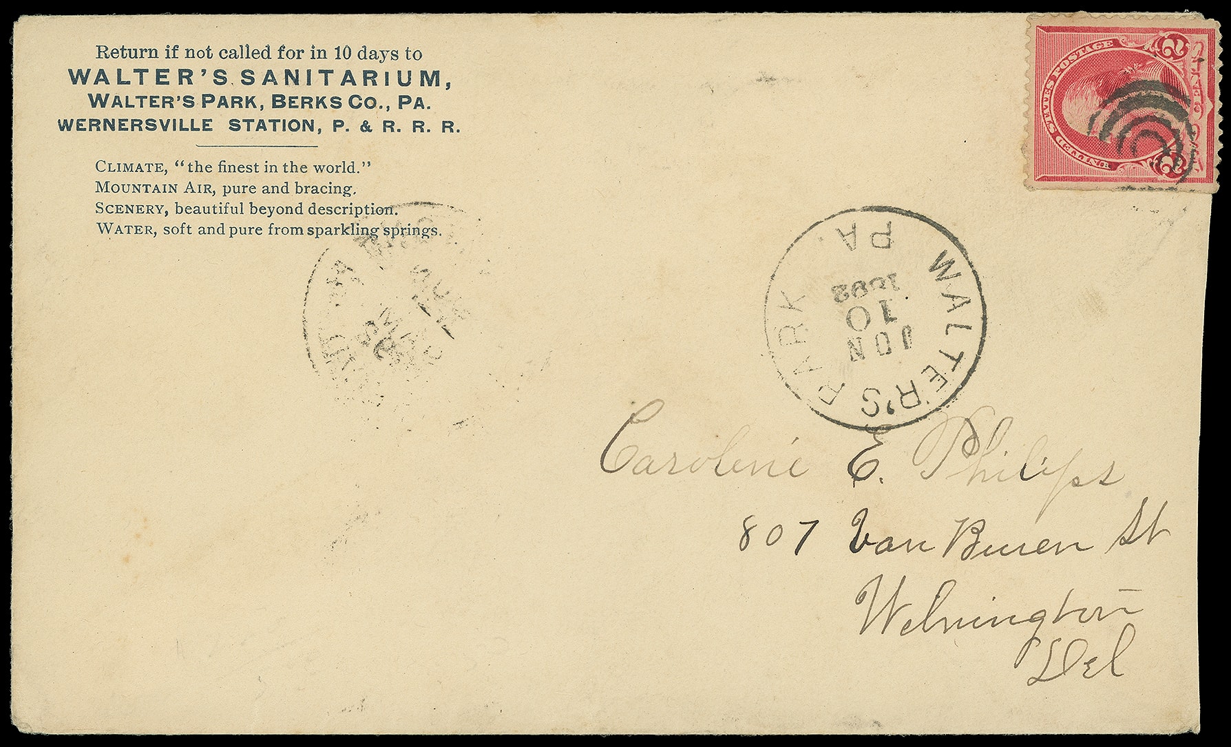 Sanitarium, Walter's Park, Berks Co., Pa. Corner card noting "Climate, the finest in the world.", "Mountain Air, pure and bracing" etc on cover bearing 2¢ carmine (220) tied by target cancel, atching "Water's Park Pa., Jun 10, 1892" cds to