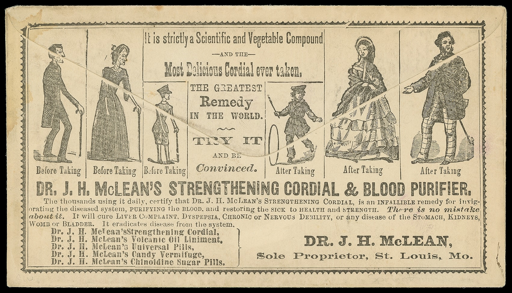 Strengthening Cordial & Blood Purifier, Dr. J.H. Mclean, St. Louis Mo. Overall illustrated advertising showing patients before and after treatment on reverse of cover bearing 3¢ green (247) canceled by ms., matching ms. "Springtown Ark.