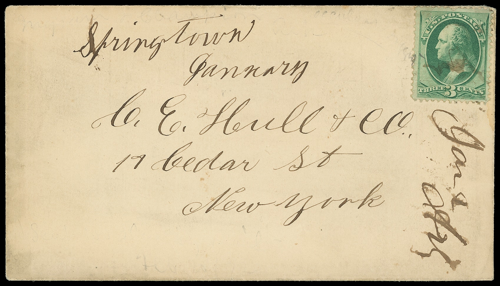 Jan. 2" postmark to New York City, original 1871 enclosed letter indicating they have a druggist in Springtown that they would be glad to act as an agent for and request a small assortment of medicine to sell on consignment, Very Fine and rare