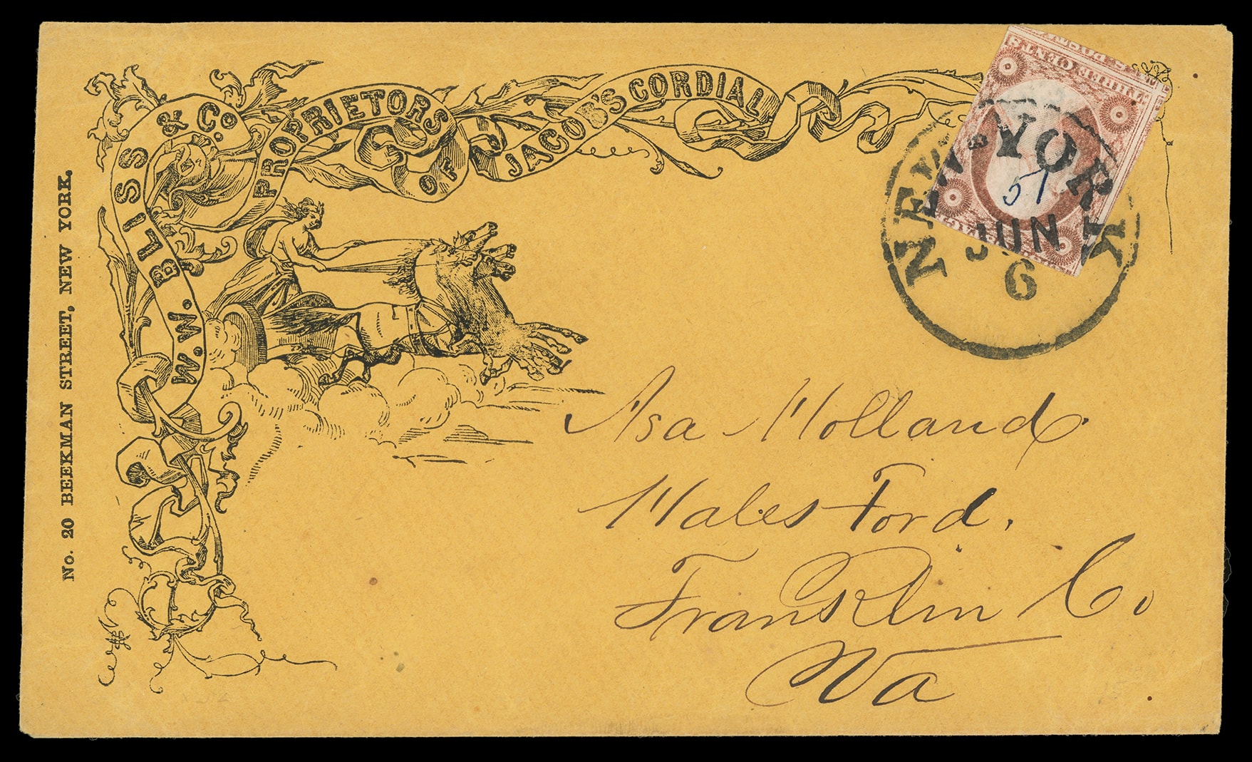 Bliss & Co., Proprietors of Jacob's Cordial, New York N.Y. Illustrated design showing Women Riding Four-Horse Chariot and decorative banners on orange cover bearing 3¢ rose (11A), misscut with huge margins to in, tied by