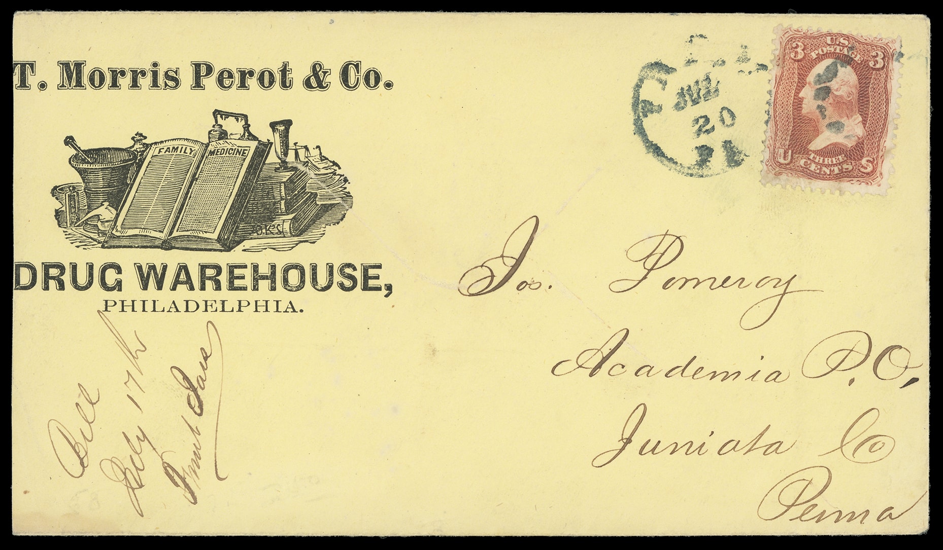 Perot & Co., Drug Warehouse, Philadelphia Pa. Illustrated advertising corner card on yellow cover bearing 3¢ rose (65) tied by "Phila. Pa. Jul 20" Philadelphia cds duplex with partial grid to Academia Pa., July 17th docketing;