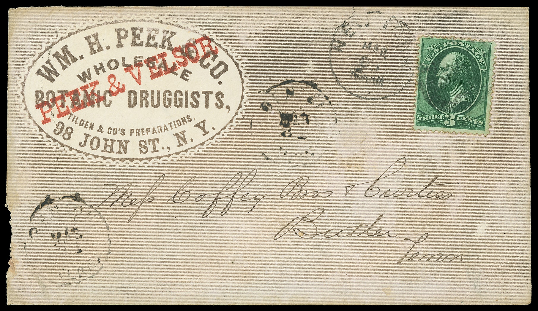Co. Preparations, Wm. H. Peek & Co. Botanic Druggists, N.Y. Ornate oval advertising corner card shaded ad with red "Peek & Velsor" ownership update on cover bearing 3¢ green (158) tied by cork cancel duplexed with "New York, Mar 25"