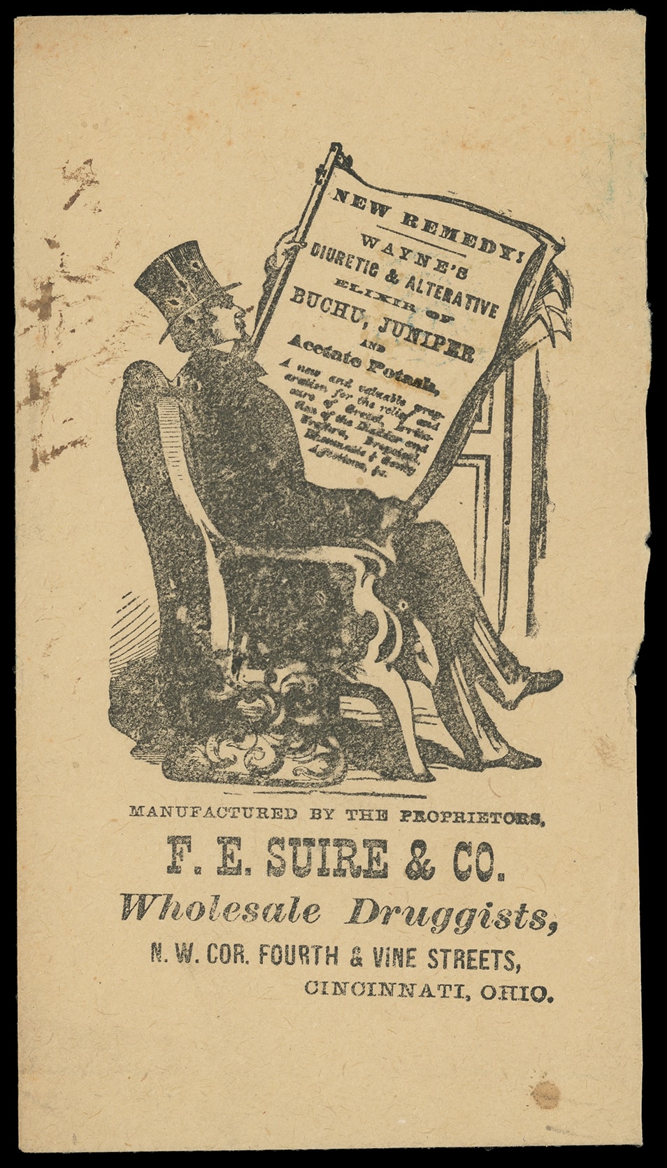 Diuretic & Alternative Elixer, F.E. Suire & Co., Cincinnati Ohio. Illustrated advertising showing man with top hat on buff cover bearing on reverse 3¢ green, grilled (136) canceled by blue four-ring cancel duplexed with bold "Cincinnati, O.