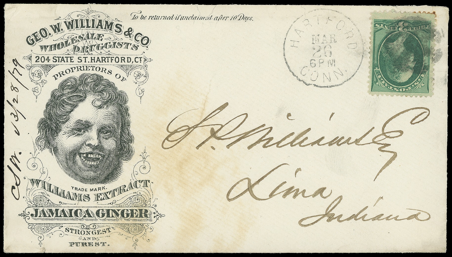Extract Jamaican Ginger, Geo.W. Williams & Co, Hartford Conn. Illustrated advertising on cover bearing 3¢ green (158) tied by cork cancel duplexed with "Hartford, Conn. Mar 26" cds to Lima, Indiana; some light toning, couple small