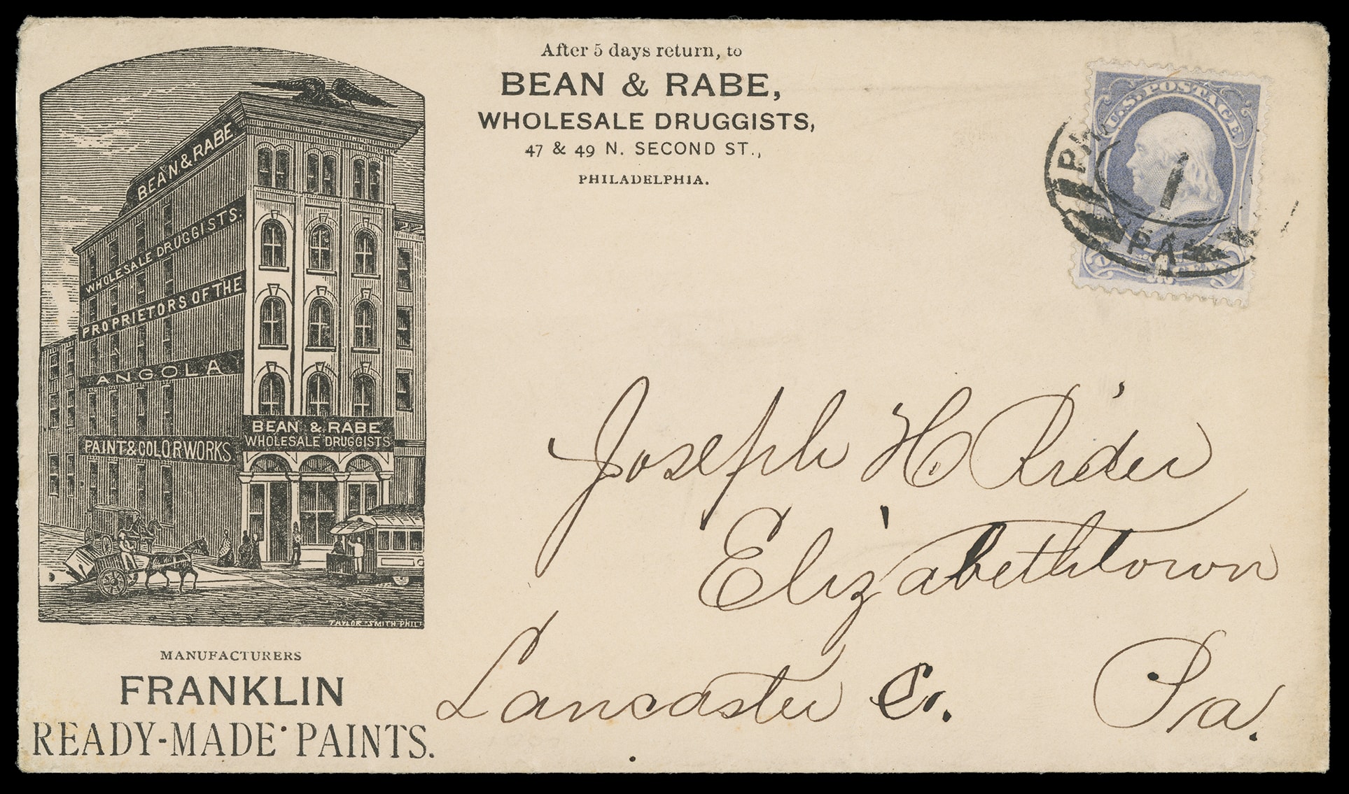 Druggist) Bean & Rabe Wholesale Druggists, Philadelphia Pa. Illustrated building advertising with additional text advertising on reverse of unsealed cover bearing 1¢ gray blue (206) tied by partial "Philadelpha, Pa." double oval to