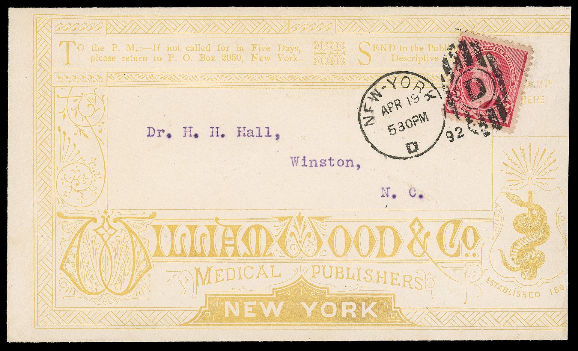 Wood & Co., Medical Publishers, New York N.Y. Overall yellow illustrated advertising showing snake on 1892 cover bearing 2¢ carmine (220) tied by "New York, D, Apr 19 '92" duplex to Winston N.C.; reduced at right, otherwise fresh and