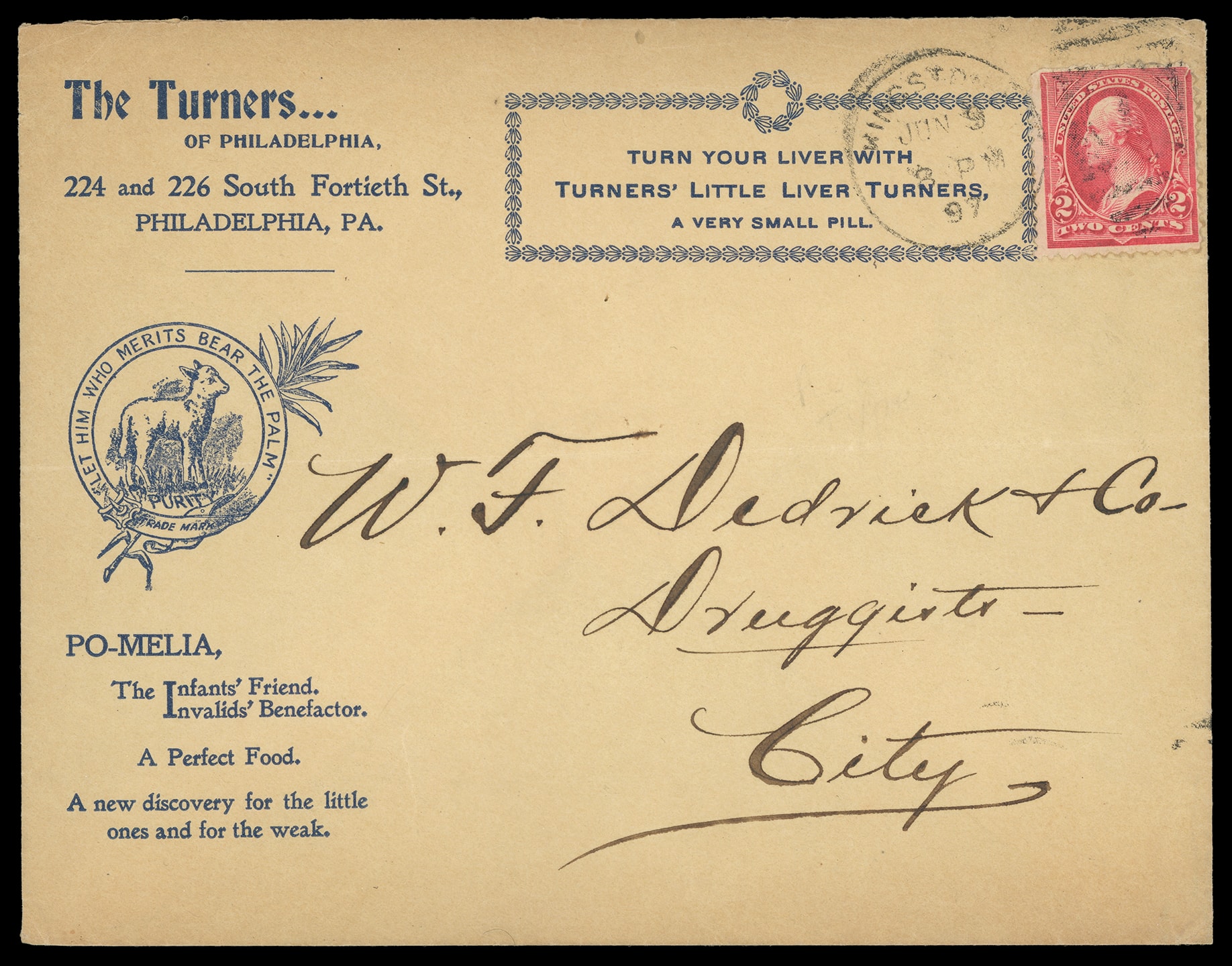 Turners, Philadelphia, Pa. Blue illustrated designs including boxed "Turn Your Liver With Turners' Little Liver Turners. A Very Small Pill" slogan on larger size buff cover bearing 2¢ red (279B) tied by "Winston, Jun 9 '97" duplex to local
