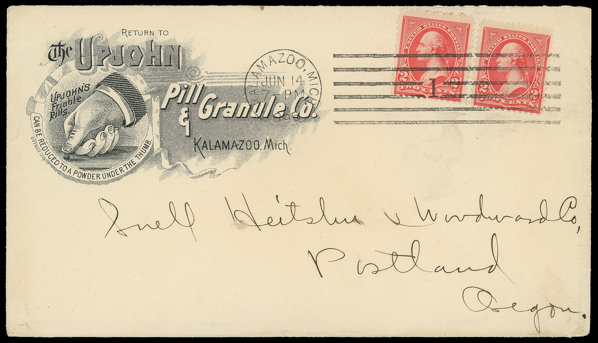 Friable Pills, The Upjohn Pill & Granule Co., Kalamazoo Mich. Illustrated ad showing "Can be Reduced to a Powder under the Thumb" slogan illustration on cover bearing two 2¢ rose pink (279Bc) singles tied by "Kalamazoo, Mich. Jun 14, 1895"