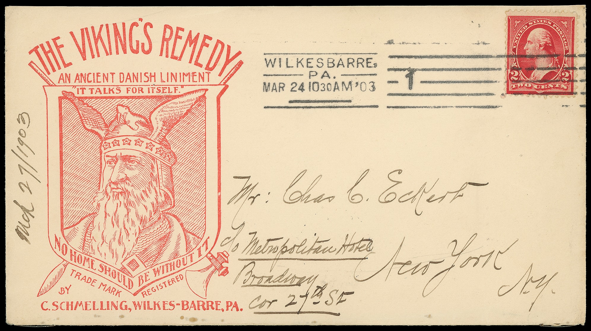 Viking's Remedy, C. Schmeilling, Wilkes-Barre Pa. Red illustrated ad showing Viking with "An Ancient Danish Liniment, It Talks for Itself" slogan on cover bearing 2¢ red (270B) tied by "Wilkesbarre, Pa. Mar 24 '03" machine cancel to New