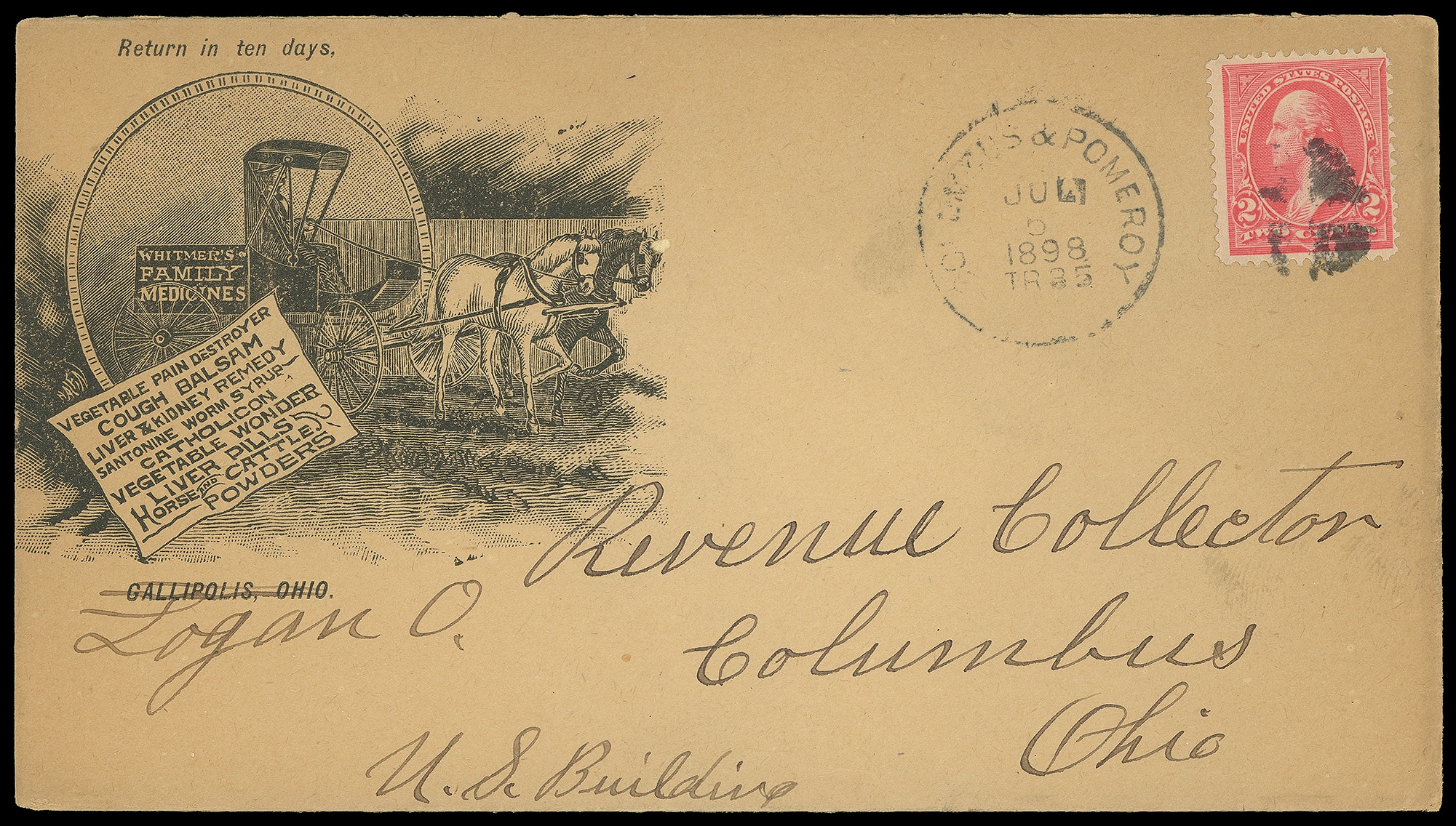 Family Medicines, Logan, Ohio. Illustrated corner card showing horse and buggy for "Vegetable Pain Destroyer, Cough Balsam, Liver & Kidney Remedy…" on brown cover bearing 2¢ rose carmine (279Bc) tied by quartered cork duplexed with