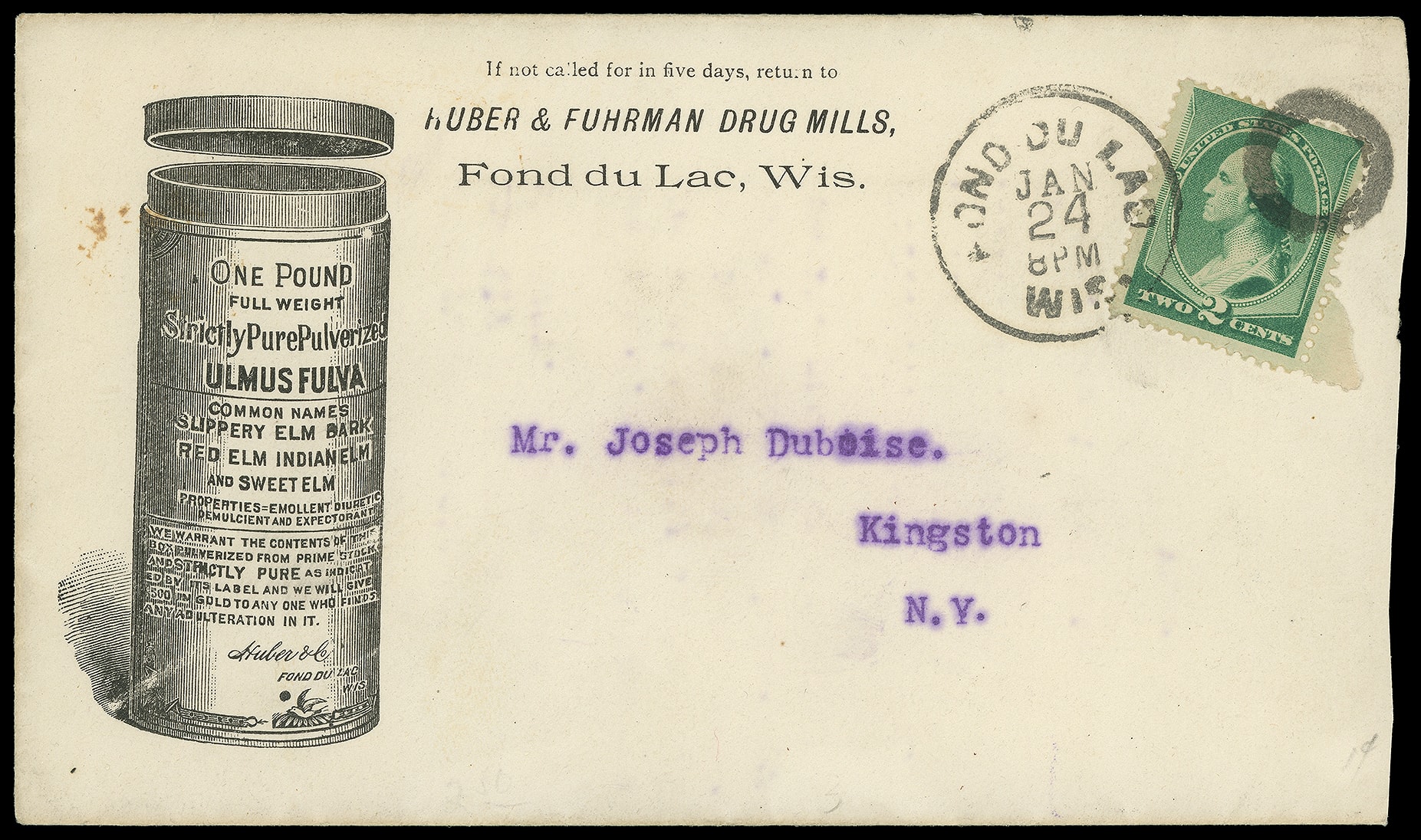 Fulva, Huber & Fuhrman Drug Mills, Fond du Lac Wisc. Illustrated ad design showing medicine canister on cover bearing 2¢ green (213) tied by "Fond du Lac, wis. Jan 24" duplex with ring cancel to Kingston N.Y., Jan. 27, 1890 arrival