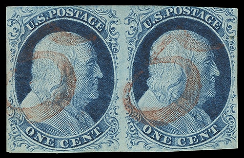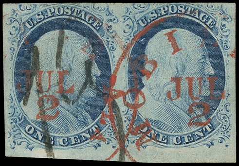 type IV. Horizontal pair, position 17-18L1L, margins to slightly in at top, rich color with strong impression, each with clear strike of large red "5" numeral cancels, F.-V.F. and rare cancel, ex-Cipolla. Scott No. 9;