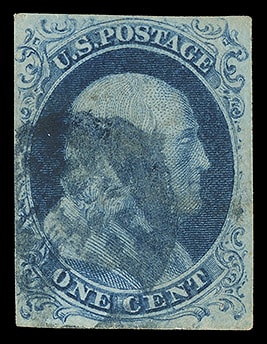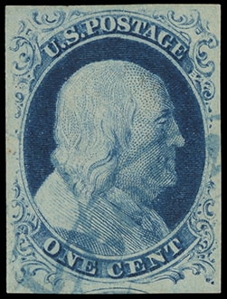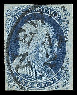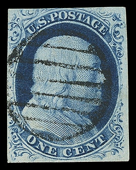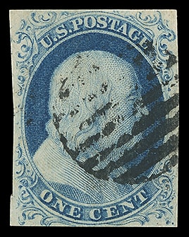 type IV. Position 99L1L, large margins, nice impression, bold blue grid cancel; tiny corner crease, Very Fine appearance. Scott No. 9; $100. (Image1)