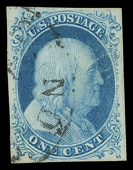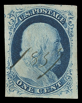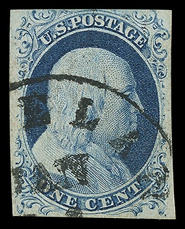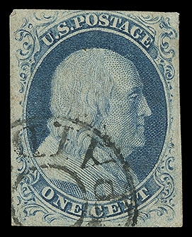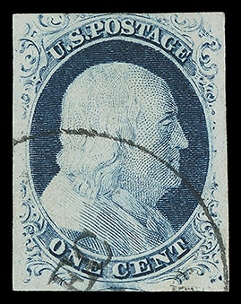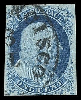 type IV, recut once at top and once at bottom. Large margins except barely touching at top, part of adjacent stamp at bottom, clear impression, sharp town cds, Very Fine. Scott No. 9; $100. (Image1)