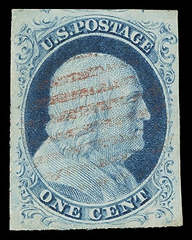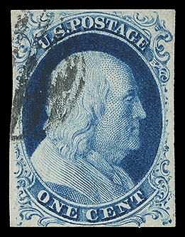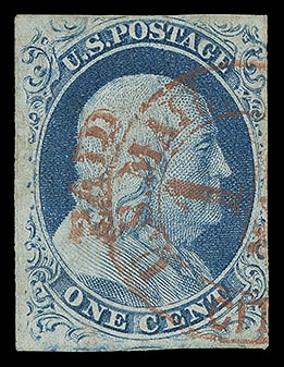 type IV. Position 56L1L, four large to huge margins including part of adjacent stamp at top, bright color with light red grid cancel; faint wrinkle, Extremely Fine appearance. Scott No. 9; $140. (Image1)